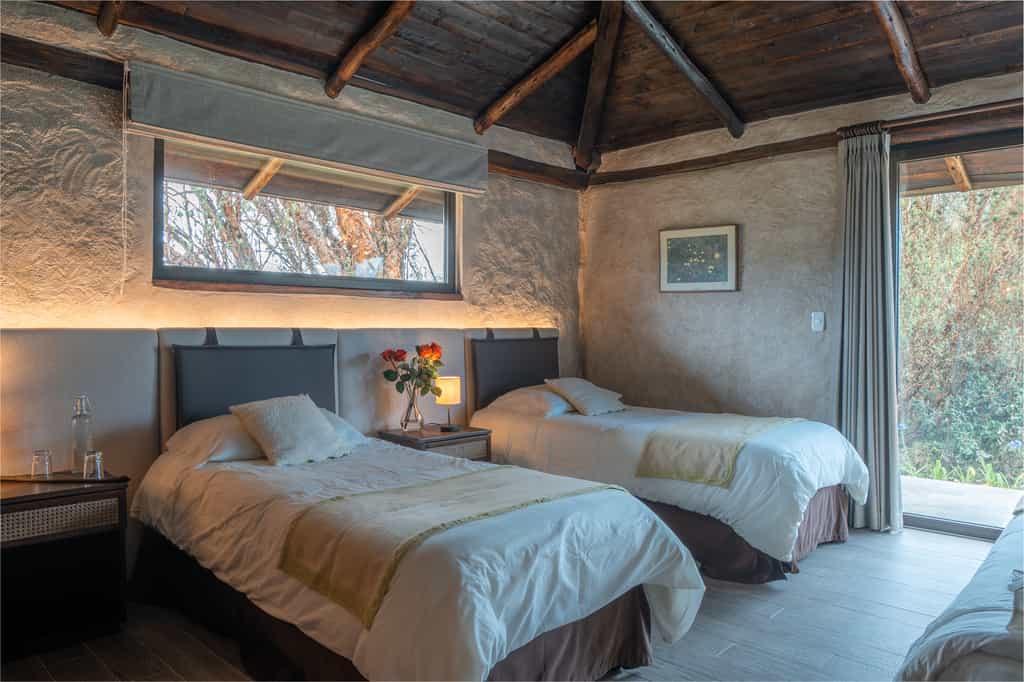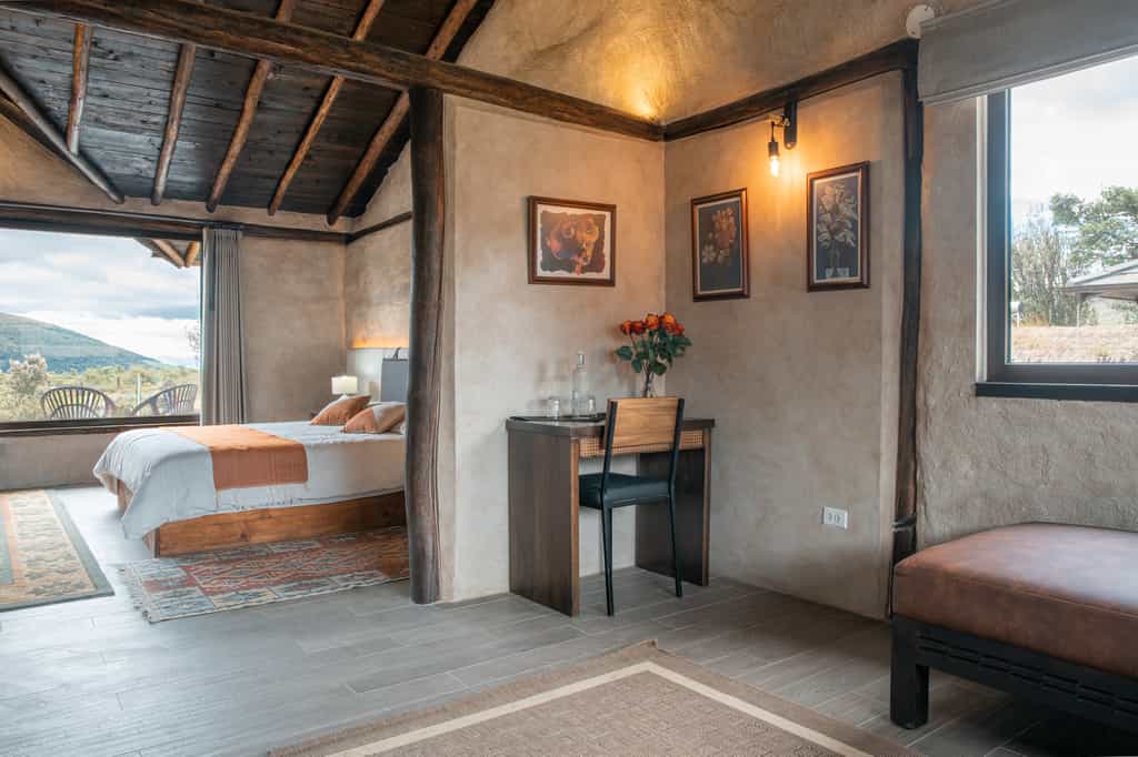 In thatched villas, there are 10 rooms with giant picture windows to let in the views of snow-hatted Cotopaxi and the pretty Andean páramo. The rooms are simply but tastefully done with wood-burning stoves, alpaca wool ponchos and heavy duvets topped by colourful runners. The en-suite bathrooms have a shower and biodegradable toiletries. The Family Cabins can accommodate up to five people and feature private living rooms with beanbags to recline on.