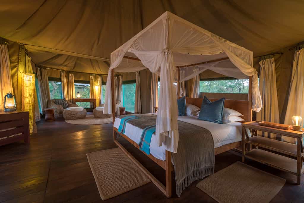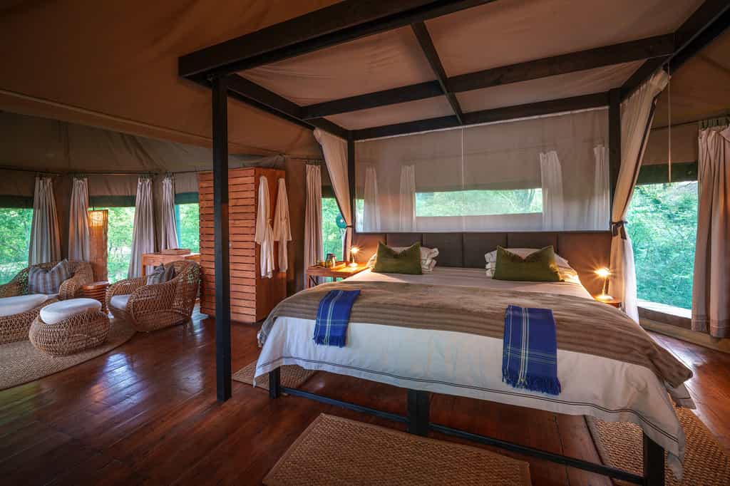 Sleeping under canvas is always magical but with vaulted canvas ceilings, huge four-poster beds and stripped wooden floors, the rooms at Chindeni make it feel extra special. All rooms also have a mini inside sitting area, outside balcony with hammock and chairs and a writing desk for any Ernest Hemingway moments. Bathrooms are ensuite and come complete with smart white china fittings and plenty of hot water.