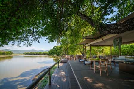 The open dining and lounge area is raised on stilts over the lagoon to the make most of the impressive view. The multi-level decking is wound around majestic old tamarind and ebony trees and meals are usually served on the top floor, whereas underneath is reserved for relaxing with wicker sofas and chairs dotted around in the shade. From the bar, there are steps down to the edge of the lagoon for pre-dinner drinks with a difference.
