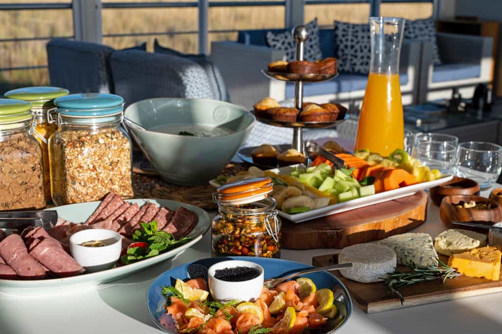 The communal deck incorporates a lounge and bar with plushly cushioned seating and plenty of shade. You'll find an open-air dining area and a small plunge pool (the size of a Jacuzzi) as well. There's a second, enclosed, dining area surrounded by windows. In either setting, deliciously refined cuisine is served three times a day. Two houseboats have an upper deck area as well, where you can sunbathe or take in the views while sipping and snacking on something scrumptious.