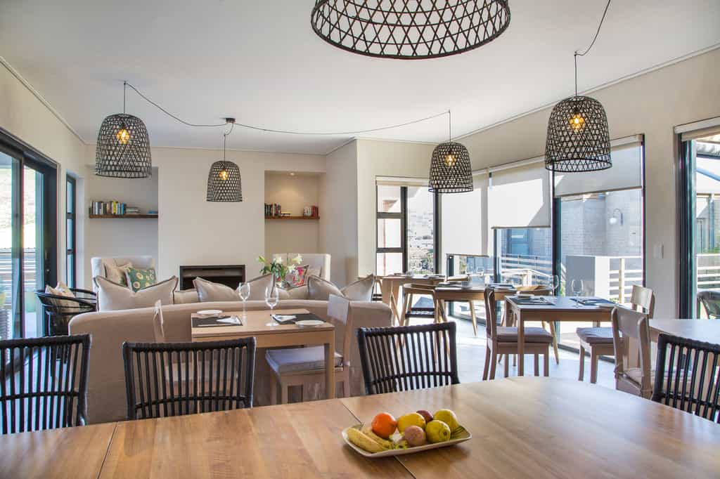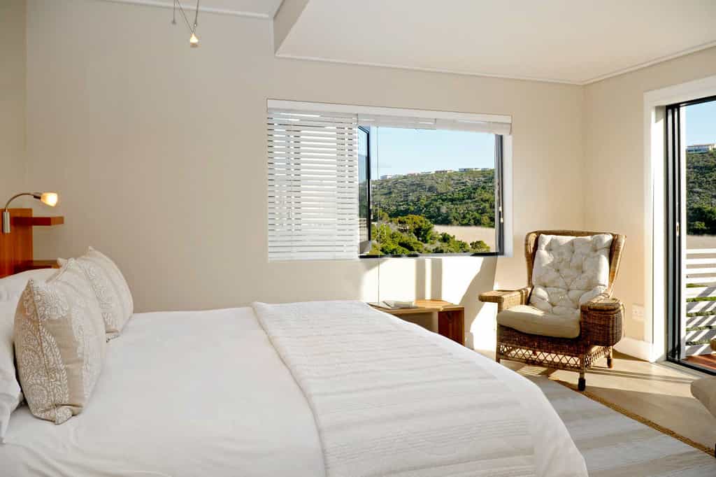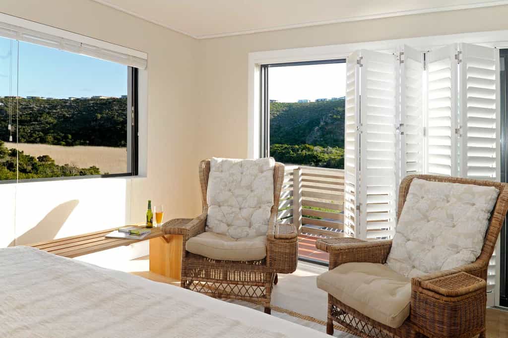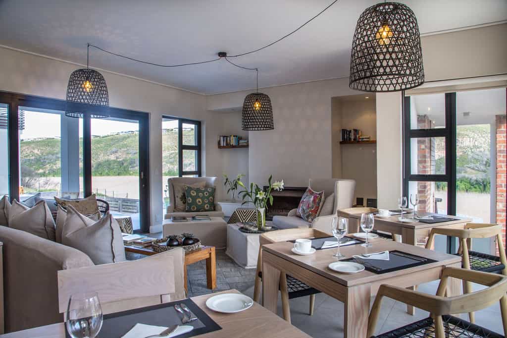 The spacious main areas are flooded with light, with wide passageways, tall doors, high ceilings and plenty of windows. The lounge and dining areas open to covered decks and glorious views of the wetlands, the ocean and the shimmering pool. The decor incorporates pieces reminiscent of the Karoo, aged furnishings in shades of brown and tan, and the aforementioned light fittings. Guests unanimously rave about the breakfasts, served between 08:30 and 10:00 am.