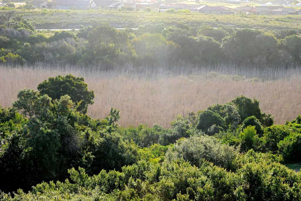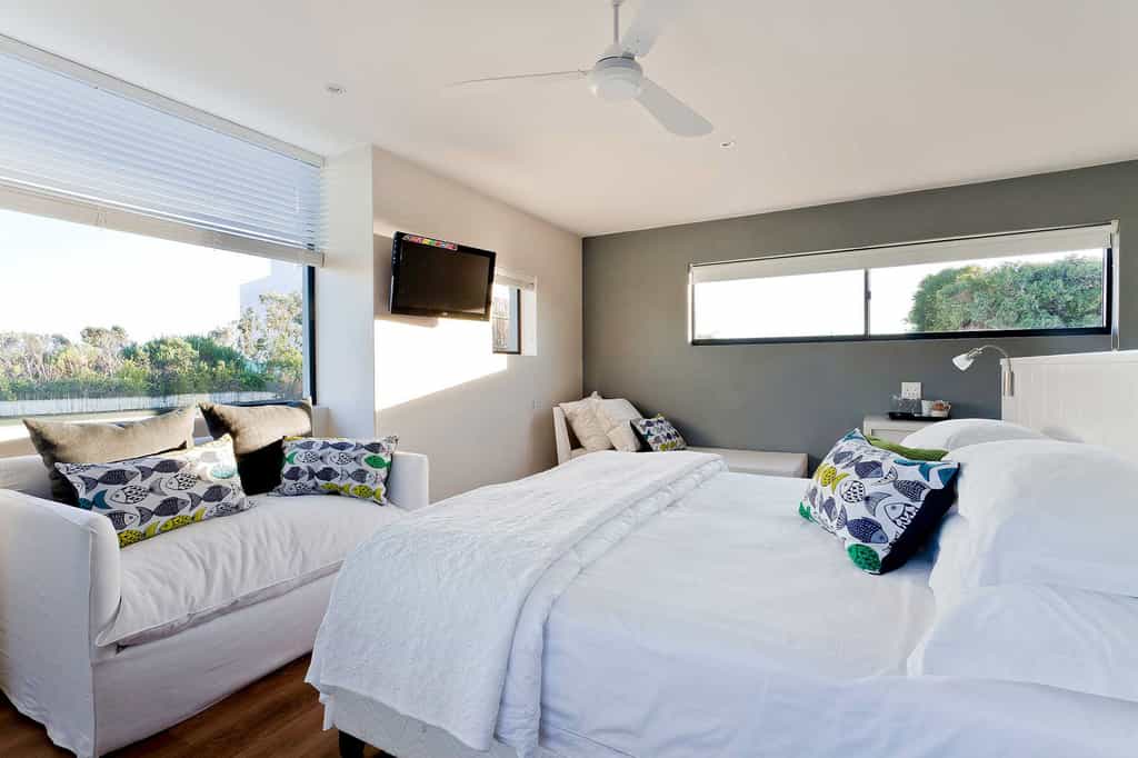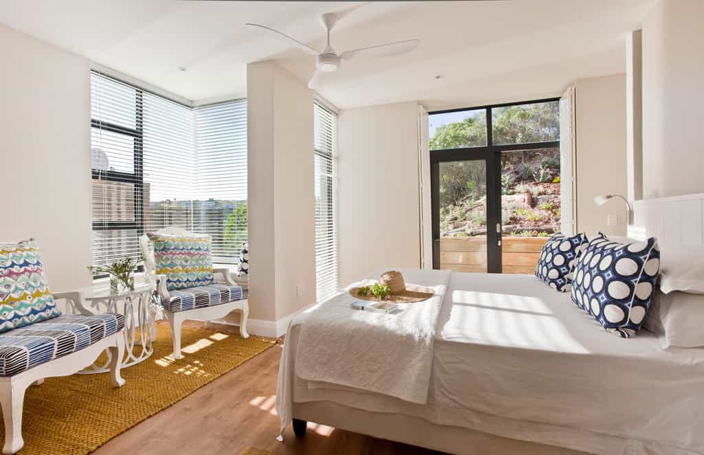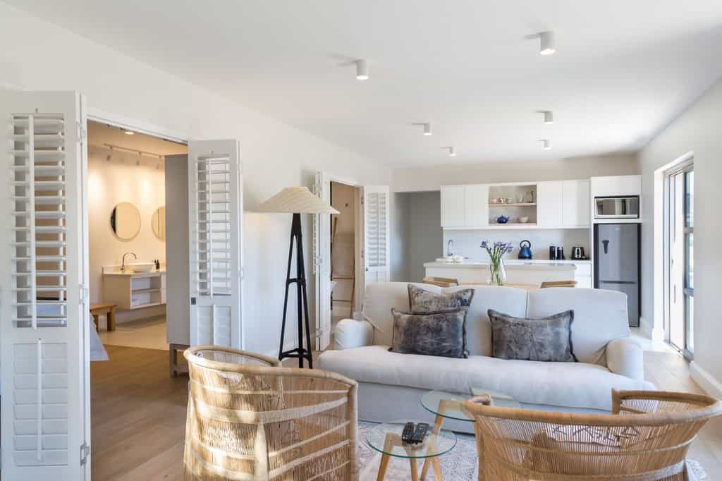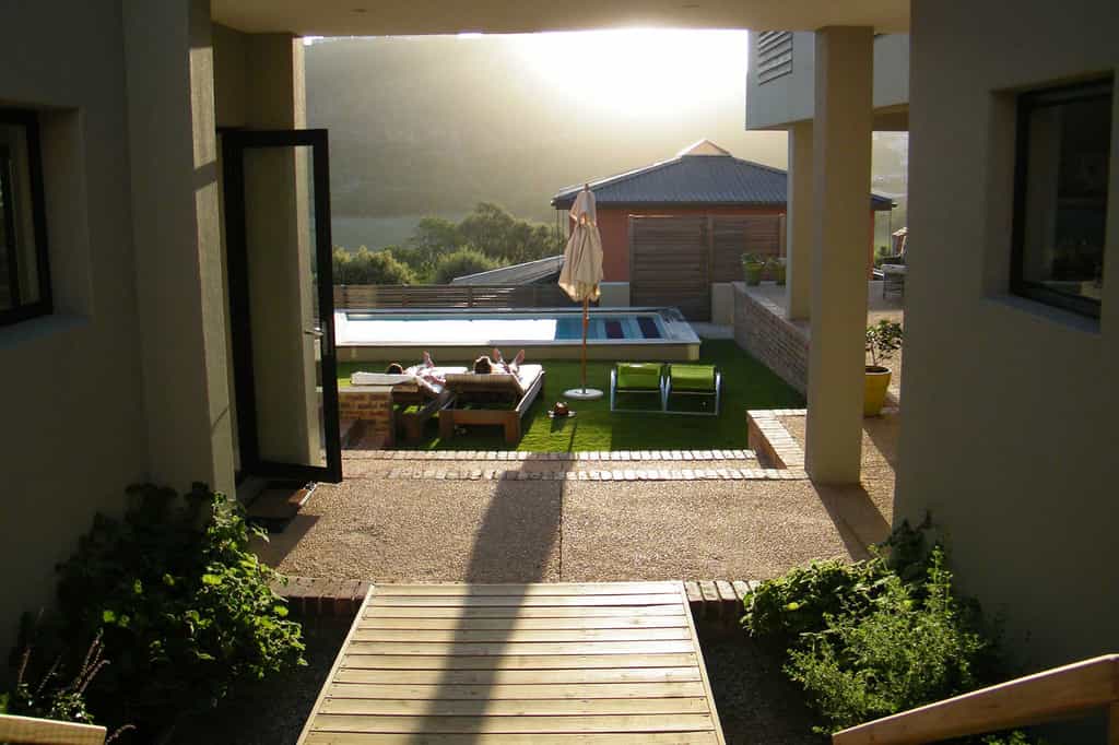 The spacious main areas are flooded with light, with wide passageways, tall doors, high ceilings and plenty of windows. The lounge and dining areas open to covered decks and glorious views of the wetlands, the ocean and the shimmering pool. The decor incorporates pieces reminiscent of the Karoo, aged furnishings in shades of brown and tan, and the aforementioned light fittings. Guests unanimously rave about the breakfasts, served between 08:30 and 10:00 am.