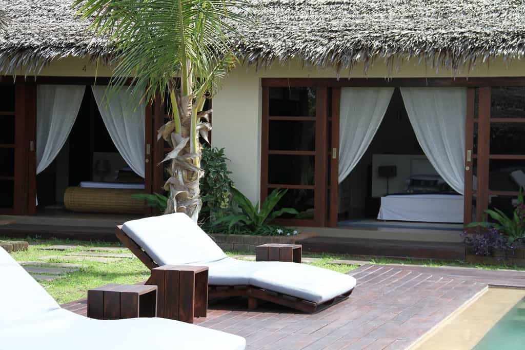 Six beautifully appointed bungalows have spacious interiors, with double or twin beds beneath mosquito nets, and superb en-suite bathrooms. The rooms open onto private patios, with fantastic sea views. Décor is stylish yet understated, as natural tones and textures mix well with contemporary touches for an altogether pleasing sense of luxury. For families, the delightful three-bedroomed villa, with its own swimming pool, is a great option. All have air-conditioning, ceiling fans, and satellite television with a DVD player.