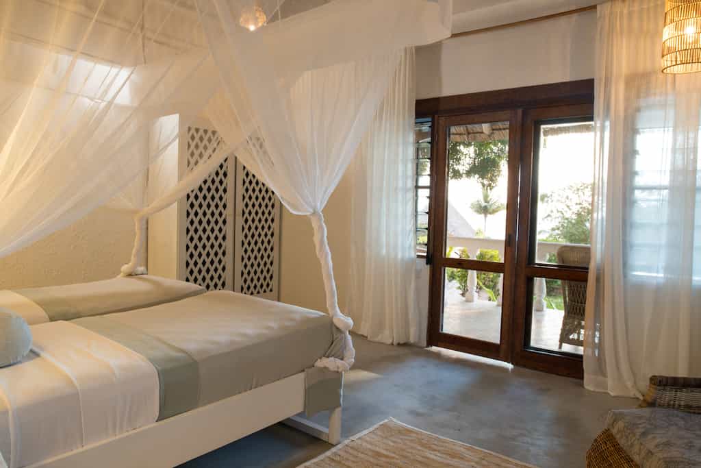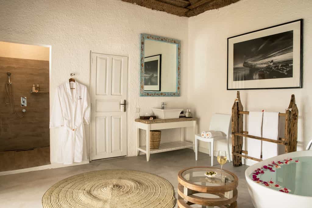 Sprawled across the palm-strewn property are 12 bungalows and a two-bedroom villa, accommodating 28 guests in total. The rooms are light and spacious, with their cool whitewashed walls and thatched roofs creating a balmy, tranquil ambience. Each has a private lounge and terrace with shimmering views across the sea to where it dips to the horizon. King-sized beds are dressed with crisp white linens, and draped with generous mosquito nets. En-suite bathrooms have large rain-showers, a basin and a toilet.