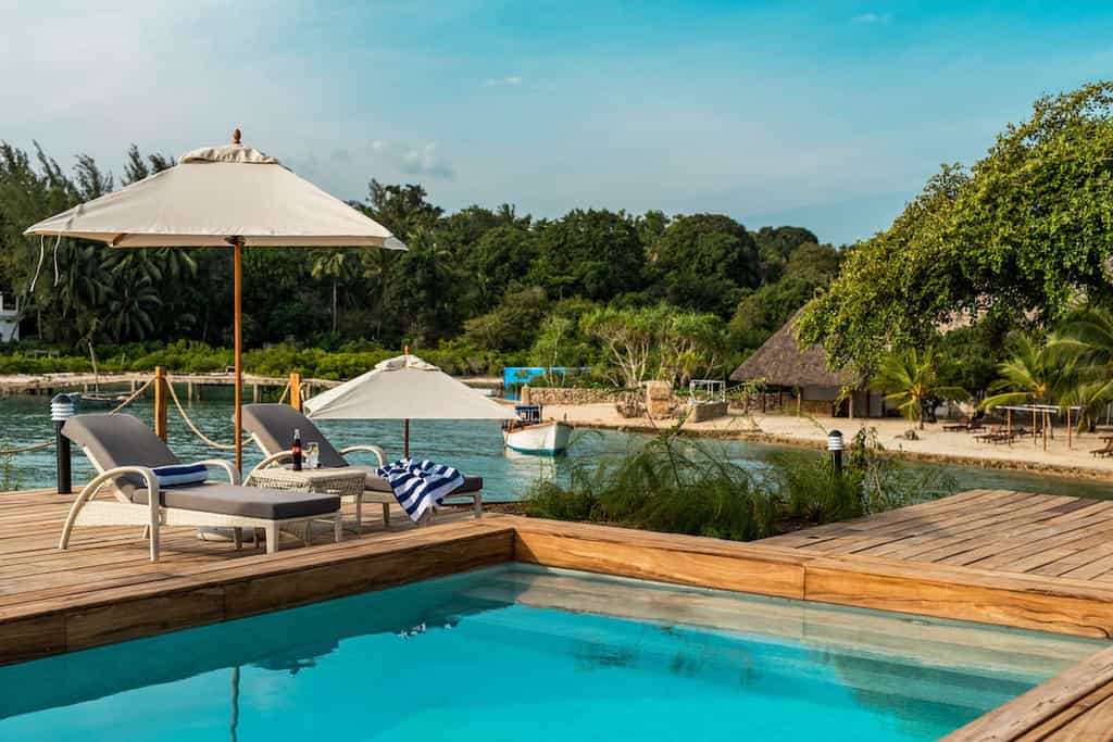 Chuini perches on the edge of a bluff, stretching back across some 1.5 hectares of ancient palatial grounds, with many ruins still present. The thatched, whitewashed buildings include two restaurants, a gorgeous lounge and several patios, decorated with appropriately beachy furniture. The tides here rise and fall dramatically, but the lodge management has created a small section of protected powdery white sand on its lagoon side, so there's always some beach for sunbathing. Enjoy the two lavish pools and spa.