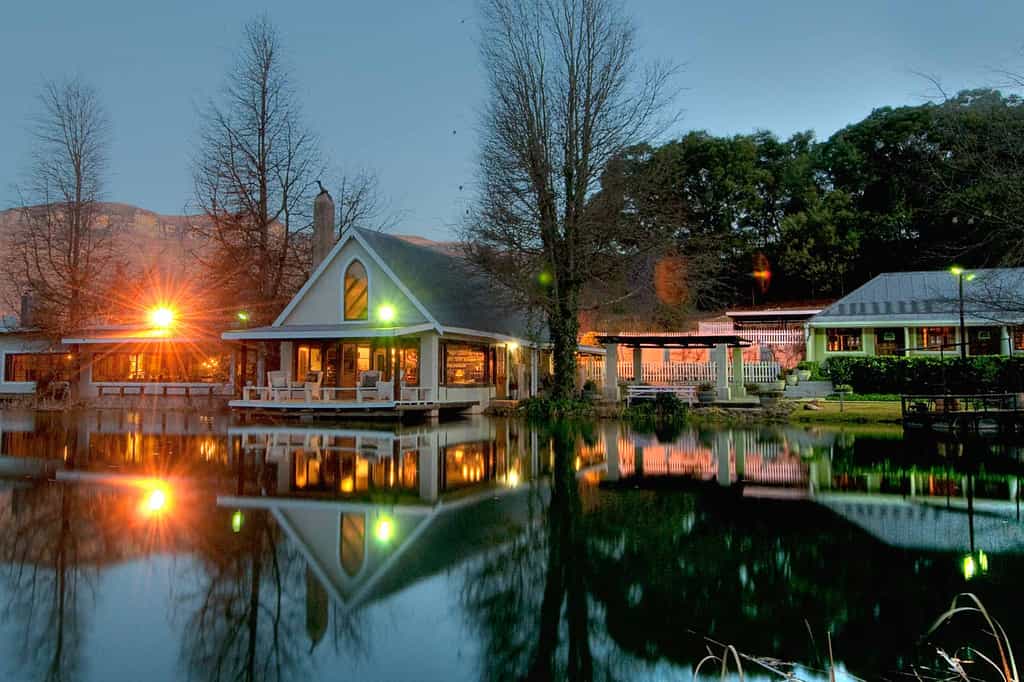 Mountains and lush greenery surround the farmhouse, whose interiors have been decorated with kitchen utensils and a treasure trove of collectables gathered during the couple's years of travel. The atmosphere is elegant but leisurely. The lounge and library are cosy, and there are blazing log fires on chilly evenings. The gardens feature herb patches and lovely rose bushes. Enjoy a spa treatment at the new Copper Pot Spa. Looking for a wedding venue? Cleopatra Farmhouse does functions well. Wi-fi throughout.