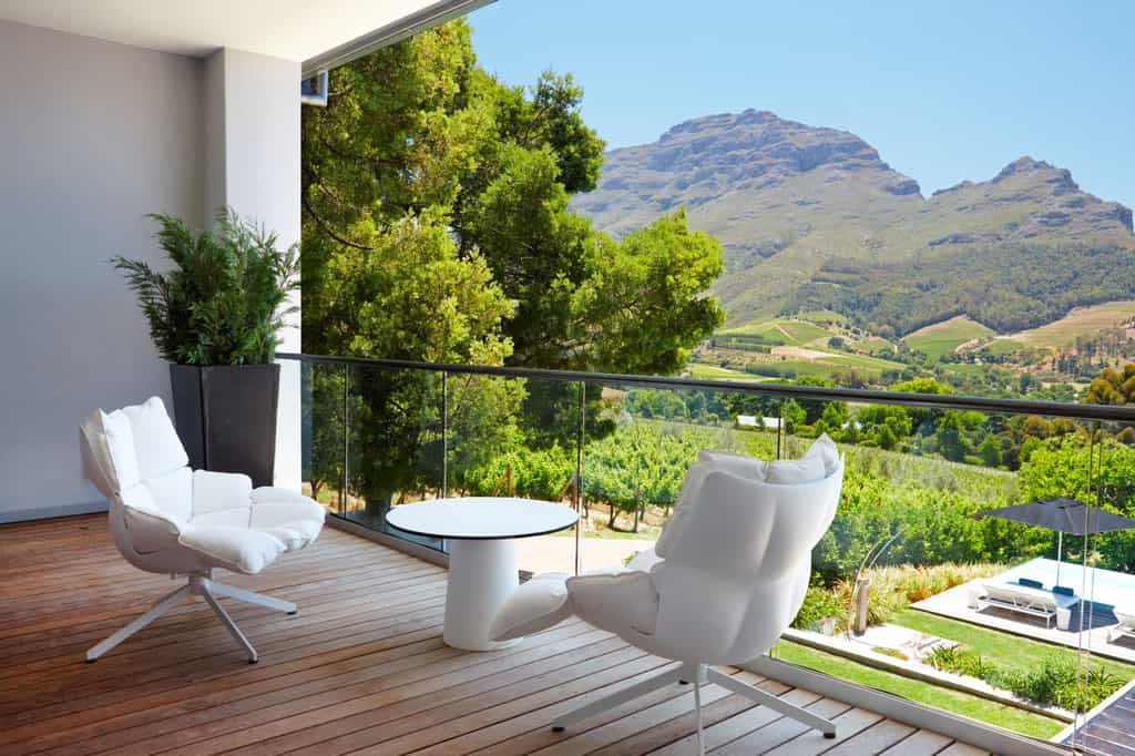 Go explore some of the award-winning wines of the region: Delaire Graff for the art, views and gourmet dining (complimentary transport via golf cart), Tokara for it’s delicious olive oils (and wines of course!) and Haute Cabriere for its easy-drinking chardonnay-pinot noir. The town of Franschhoek is a bustling and pretty place with fabulous gift shops, boutiques, galleries and coffee shops. Feel like staying in? Enjoy a meal on the terrace complimented by one of the estate’s wonderful wines.