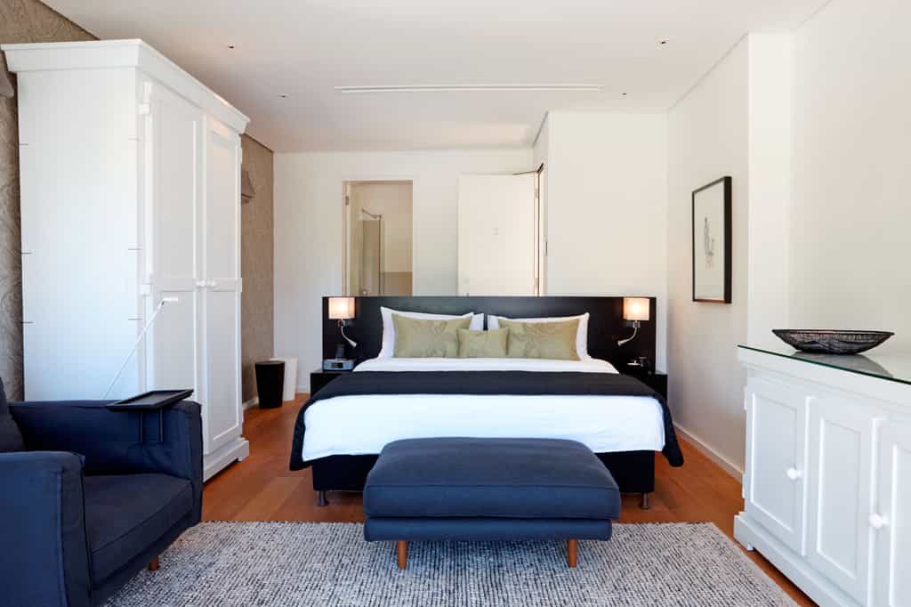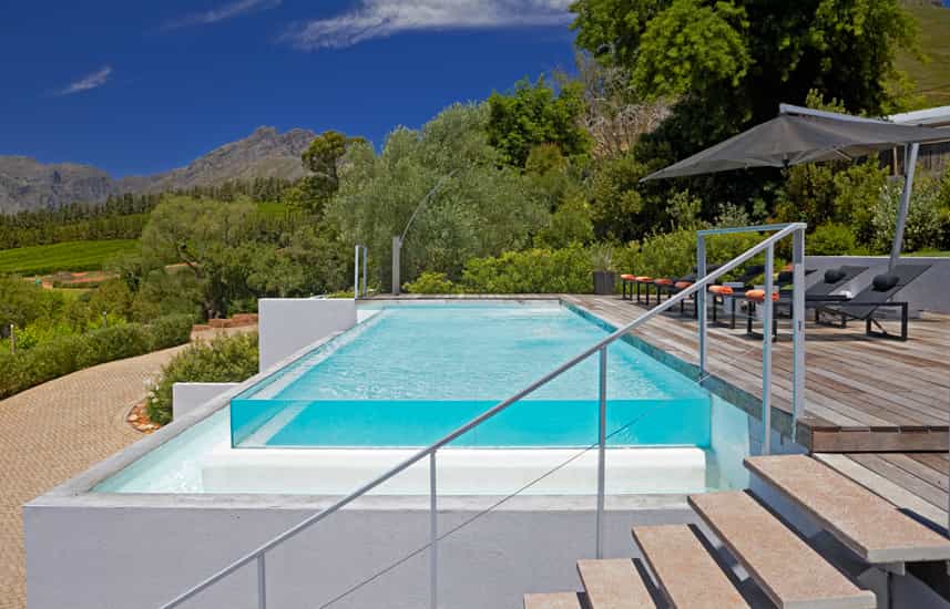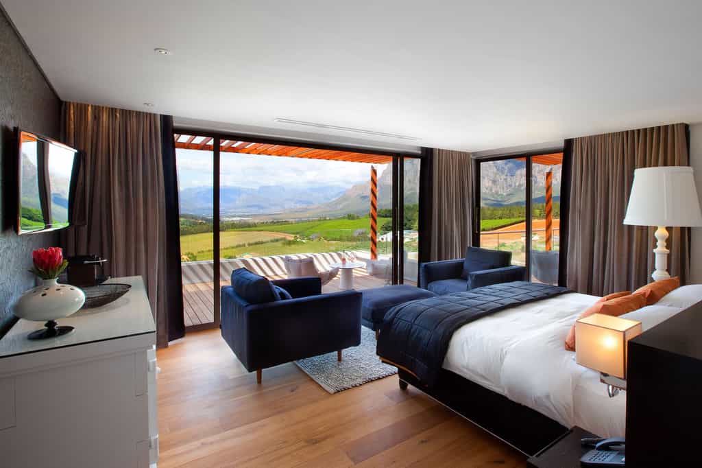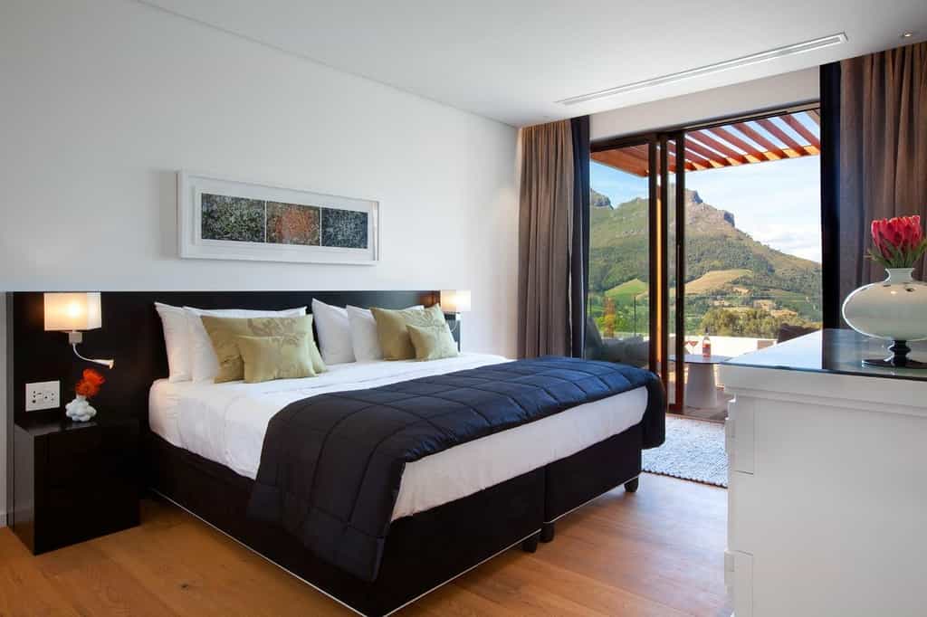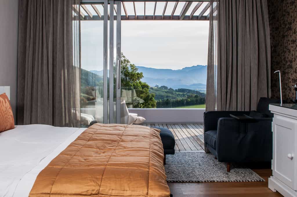 It’s all about the views at this luxurious private villa and hotel residence. The dining area has an inside or outside option, complete with roll-back glass doors and a wooden deck overlooking the sprawling lawn and stunning Hottentots Holland mountain rage. The swimming pool is off to the left with the same view and offers plenty of seating options. For cosy winter evenings, settle into the lounge, light the fire and watch the mist descend over the mountains.