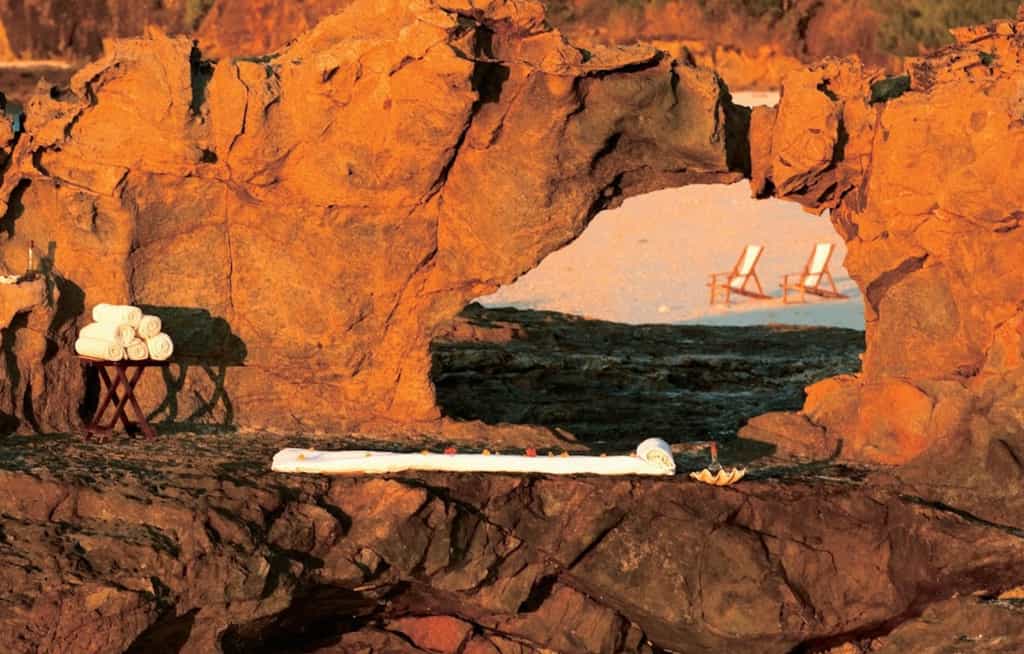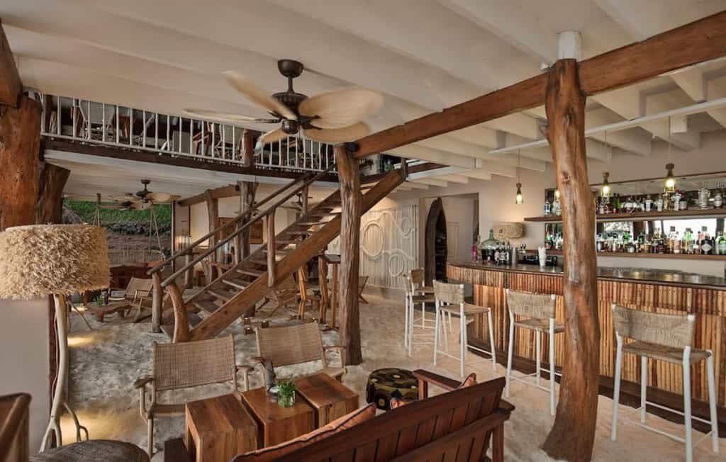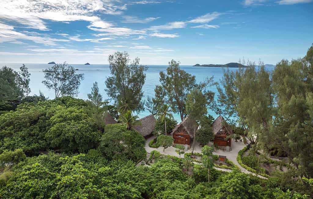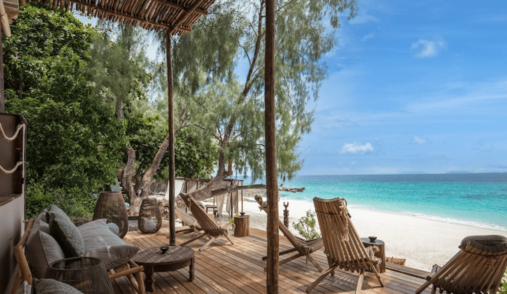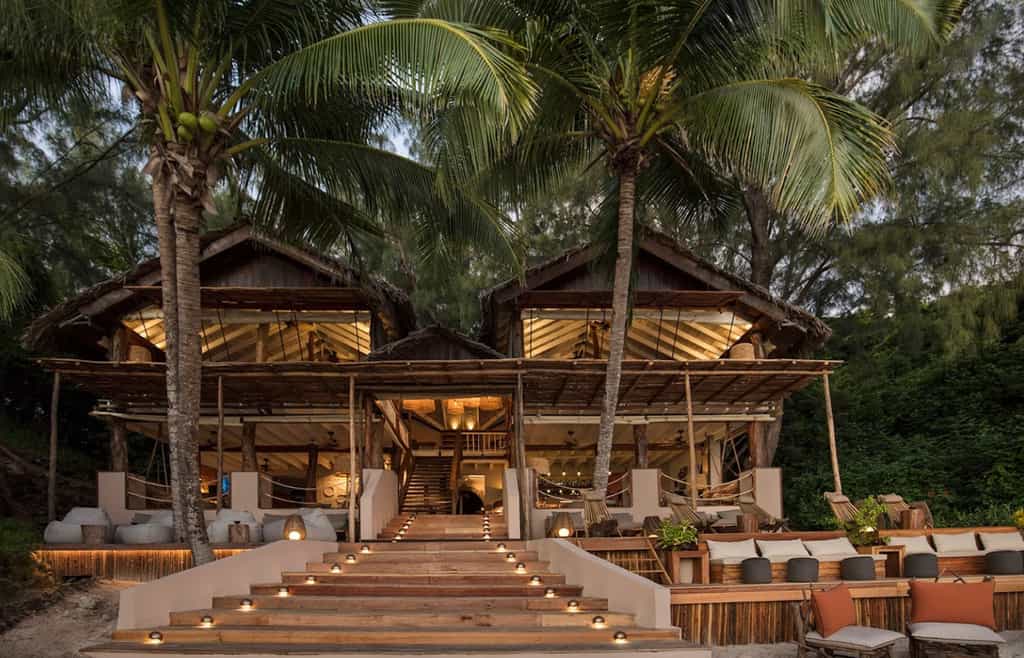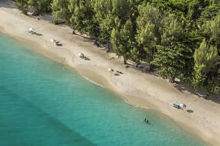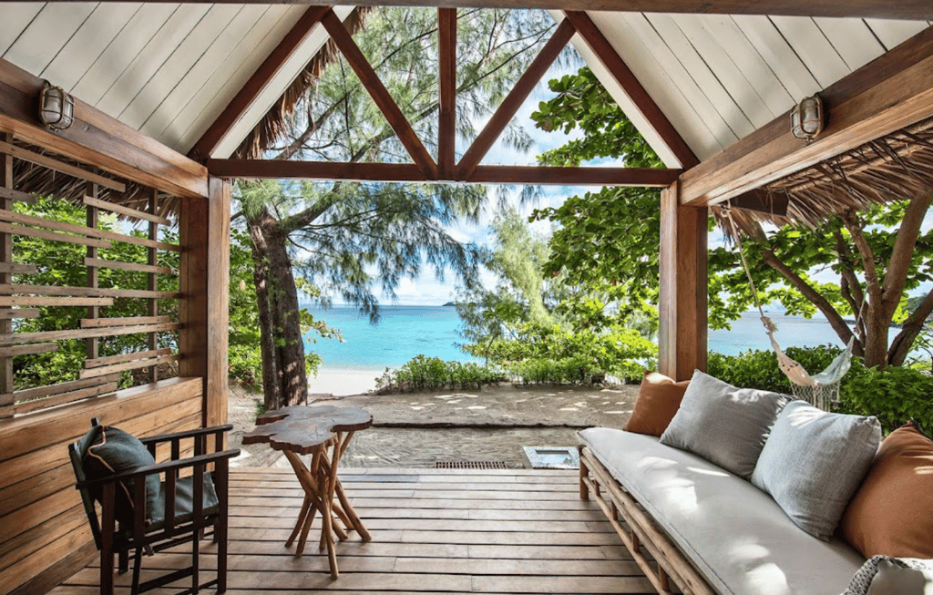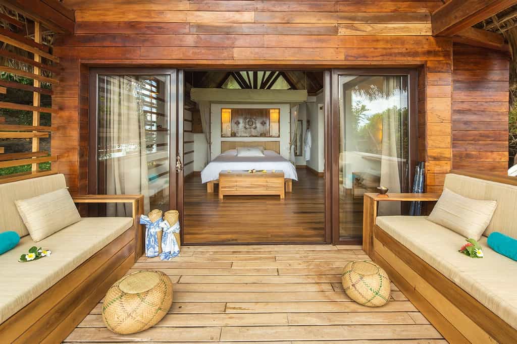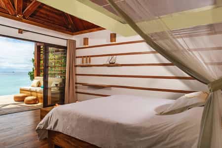 The 25 Beach Villas – divided between two beaches, North and South – appear simple from the outside, with their shaggy thatched roofs, simple wooden construction and stone base. Once inside though, all is cool sophistication. Every villa has a large netted bed and a quirky bathroom with all the luxuries. All face the sea, with verandas furnished with cushioned seating and a palm-slung hammock from which to take in the view, a palm-fringed composition of every shade of blue.