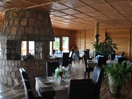 The central area, a stilted wooden structure, features a bar and, on one side of the large fireplace that is lit every evening, a comfortable seating area with a TV. The dining area is small, with a few tables set on the terrace, and serves simple but fresh and tasty fare (try the tenderest beef stew ever!). The main areas are simply stylish, furnished with nautical memorabilia and local artworks. The views, as you would expect, are incredible.
