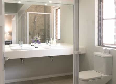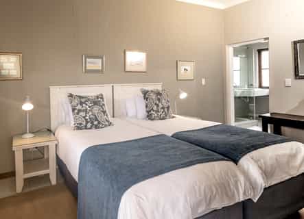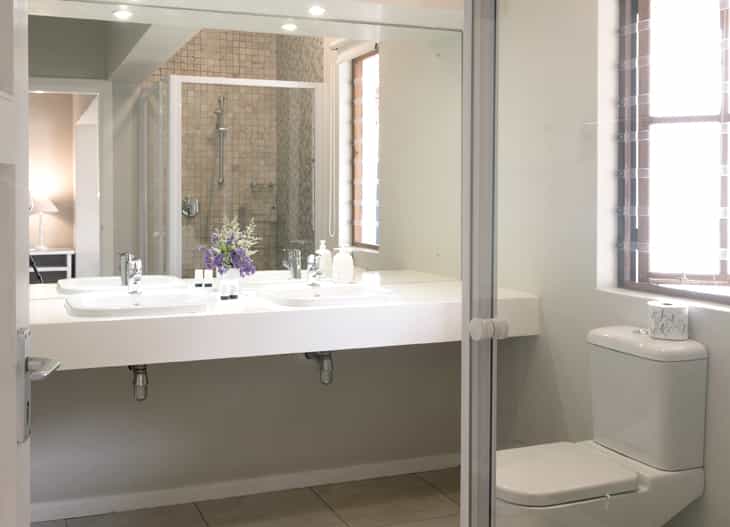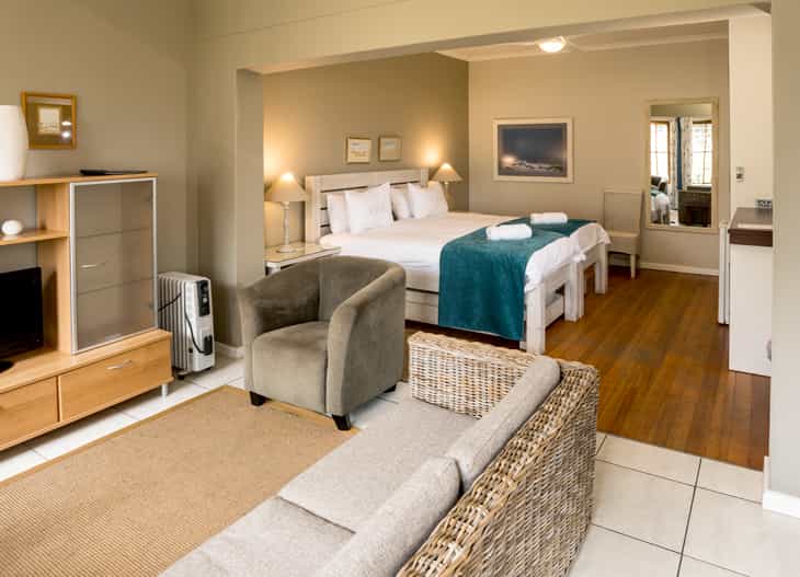 Each of the seven guest rooms has a private entrance and a neat patio with outdoor seating. Five rooms are double or twin, and two larger family rooms with a lounge area and pull-out beds can accommodate four people. Each is en-suite, with powerful solar-heated showers. Décor is pleasingly simple, with a lavender theme in soft whites, blues and lilacs giving a relaxed beach cottage ambience. Modern touches include WiFi, flat-screen satellite television, a fridge, and tea and coffee facilities.