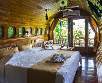 Built along a forested ridge, Costa Verde has various zones, each with its own cliffside pool and deck. The resort's social spaces were designed like they simply popped up in the jungle: the main restaurant, El Avion, is a salvaged C-123 Fairchild plane with dishes delivered by a fuselage dumbwaiter! Other dining options include La Cantina that serves barbecued specialties to the sounds of the Jungle Boys, and El Wagon, which offers casual dining with floors featuring vivid animal mosaics. If you're feeling peckish between meals, visit El Baguette for a pastry.