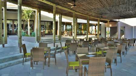 The lobby is high ceilinged and inviting, décor inspired by the beauty and colors of the Okavango Delta with fresh lime green accents amidst more natural greys and timber. There is an indoor restaurant for evening dining as well as the outdoor Terrace Bar where meals can be enjoyed throughout the day.