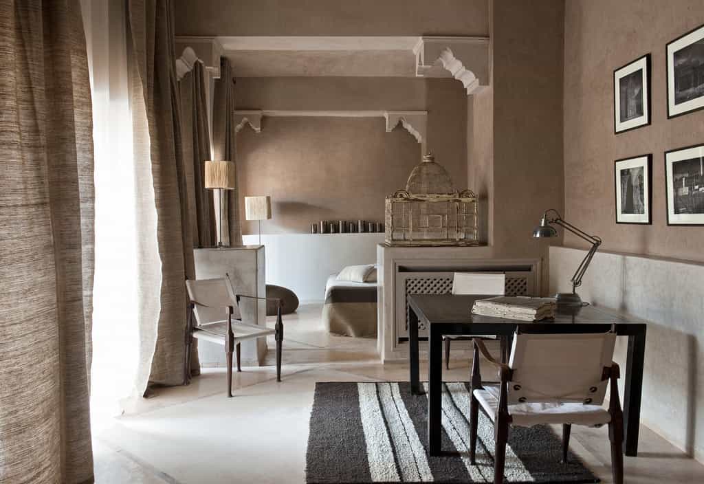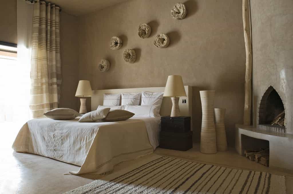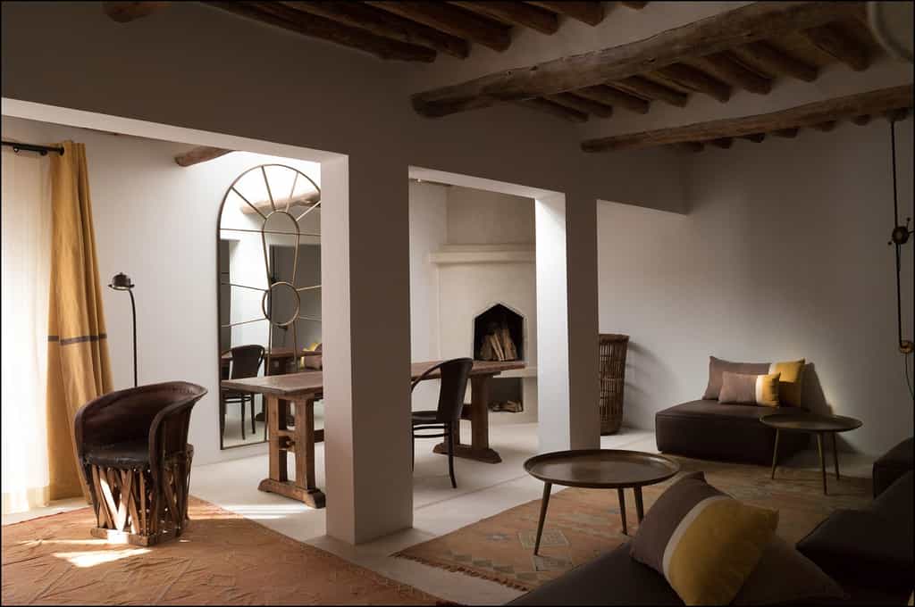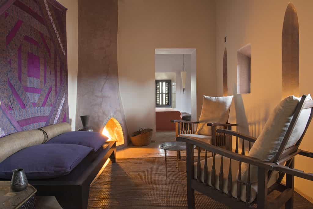 With walls of rammed earth and tadelakt plaster, the rooms have a soothing, sandy tone, echoed by the creamy linens, stone fireplaces, and cosy Berber rugs. Decor is classically Moroccan -think oversized ceramic vases and woven baskets - but with plenty of modern detailing in the industrial lights and quirky artwork. Seven rooms are located in the main kasbah, and there also seven larger garden suites, all with views of the Atlas Mountains. Suites have a private terrace, lounge, and bathroom with a large tub, fireplace and heated floors.