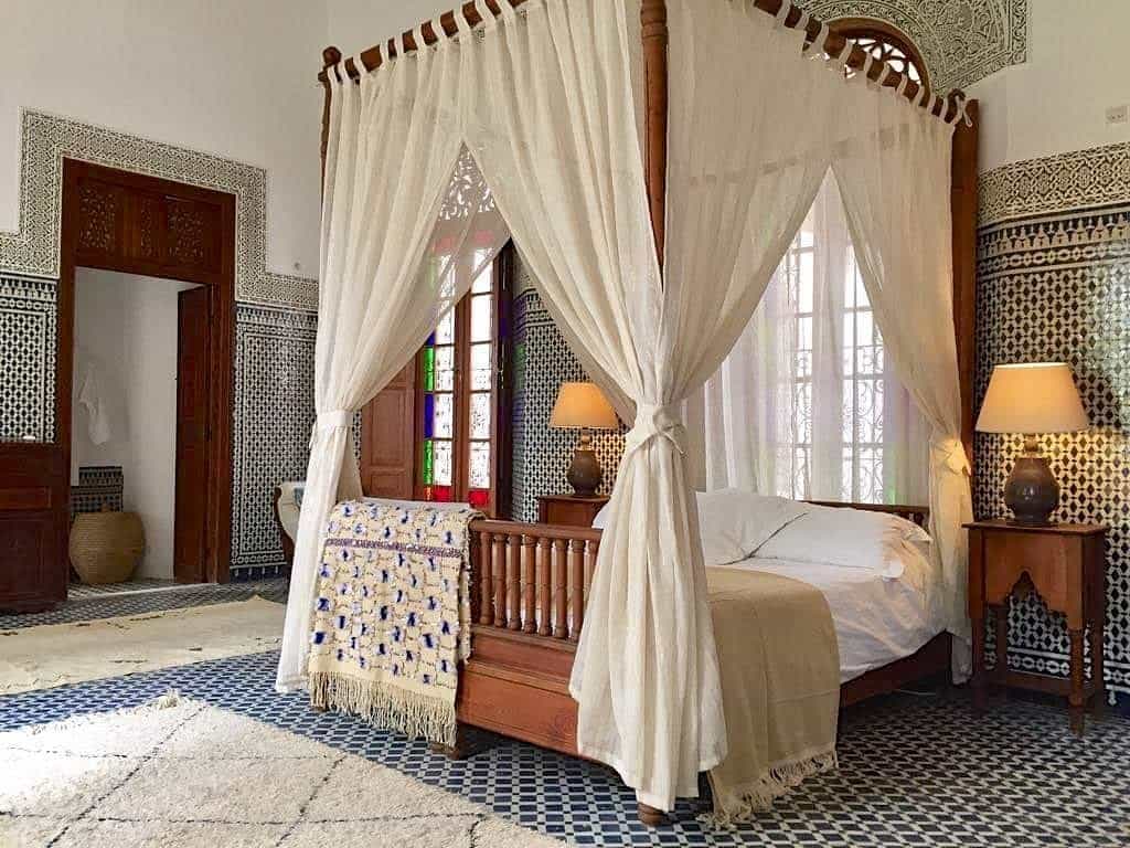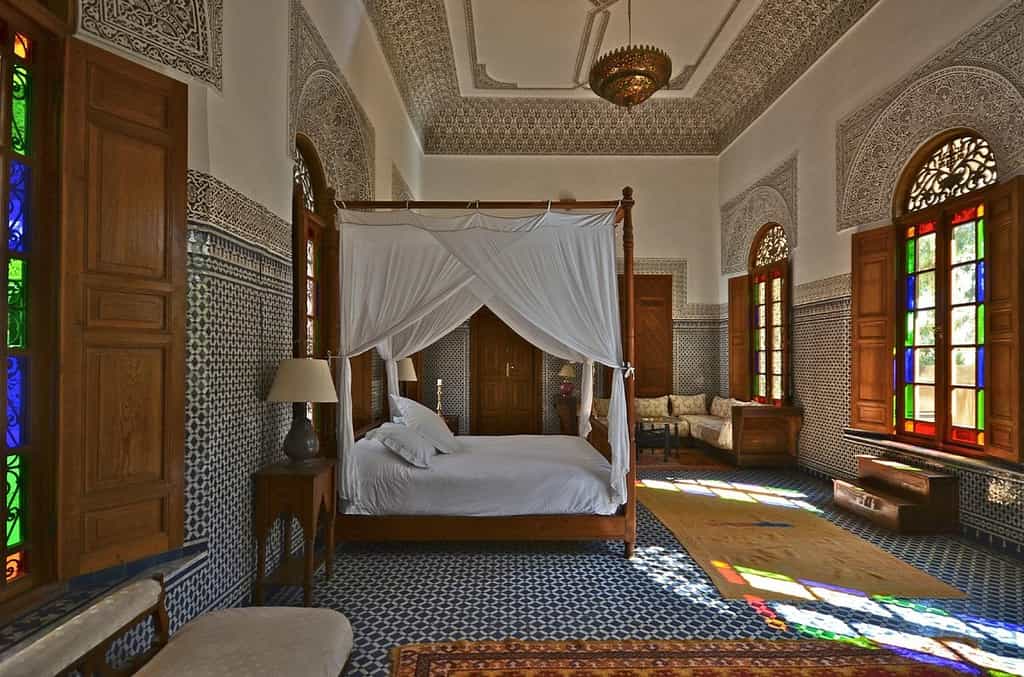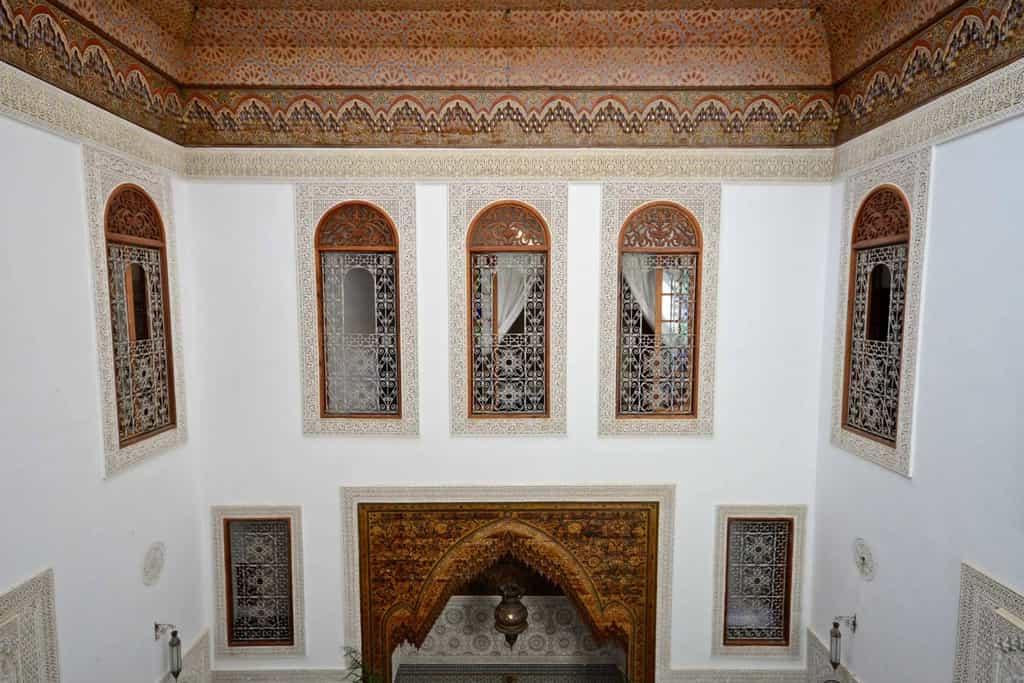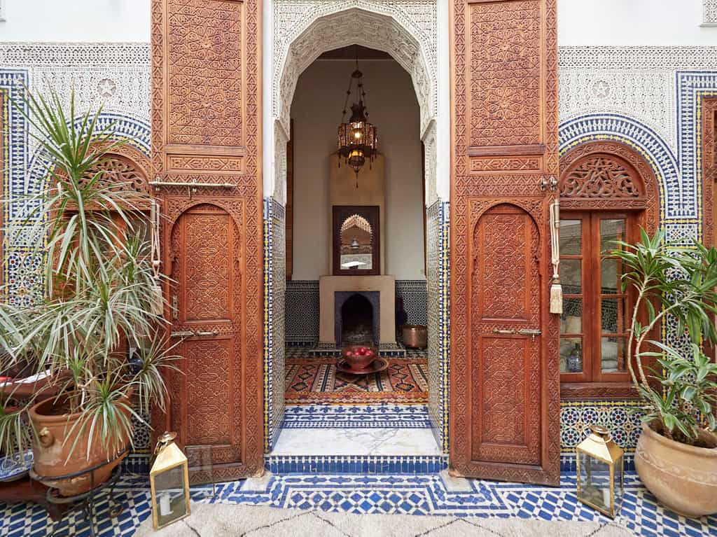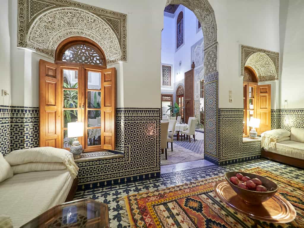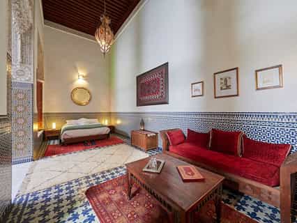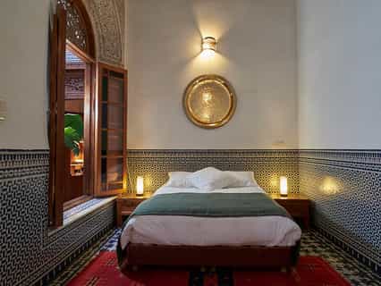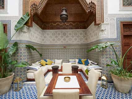 Decorated in hand-cut tiles and stuccoed arches, the central courtyard is a sunny spot for a drink as Eddie, the resident tortoise, ambles past. Soft jazz flows into the library with its deep, mustard sofas topped with peacock-feather cushions, and out onto the rooftop terrace where you'll enjoy a sundowner with views of the medina and Atlas Mountains. Most of the time, balmy weather means breakfast on the terrace, while the characterful Franco-Moroccan restaurant has a reputation as one of the best in Fez. The menu changes with the seasons, with items that range from seared ombrine fillet, to braised local rabbit, and bitter chocolate tart for dessert.