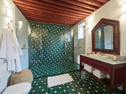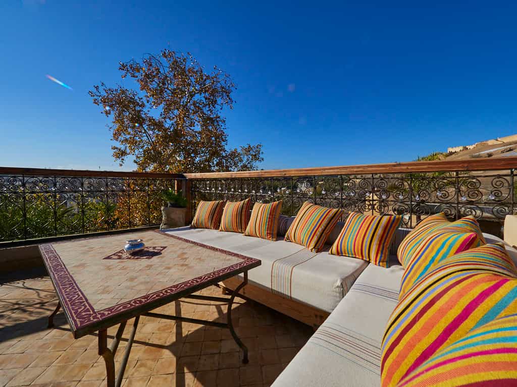 The five suites are decked out in cedar furnishings and feature carved mosaic floors and stained glass windows. Choose from the smallest Argana Suite, which is ultra private and the only room with views over the medina; the Yasmina Suite, a favourite among honeymooners with a corner bathtub, canopy bed, and private balcony; and the newest Jannah Suite, which has floor-to-ceiling windows, jewel-tone rugs and a sitting room. The bathrooms are well-appointed, some with dual showers and others with claw-foot bathtubs.