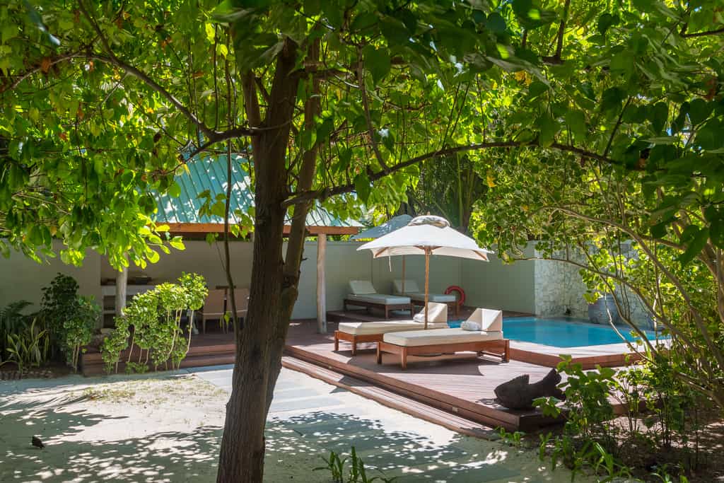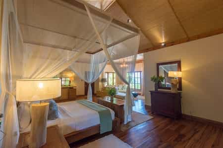 The 25 luxury beachfront cottages range from 90m2 to 350m2 in size. They’re all decorated in the same breezy colonial style with modern finishes. We love the exposed rafters and the extensive outdoor relaxation areas with day beds, salas, alfresco showers and swimming pools (pool only in the beach villas). All the cottages are on the beach with private sun loungers on their stretch of sand. Accommodation options are for two people but there are family cottage options.