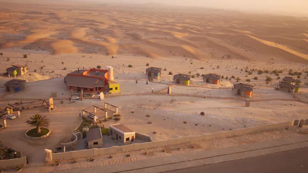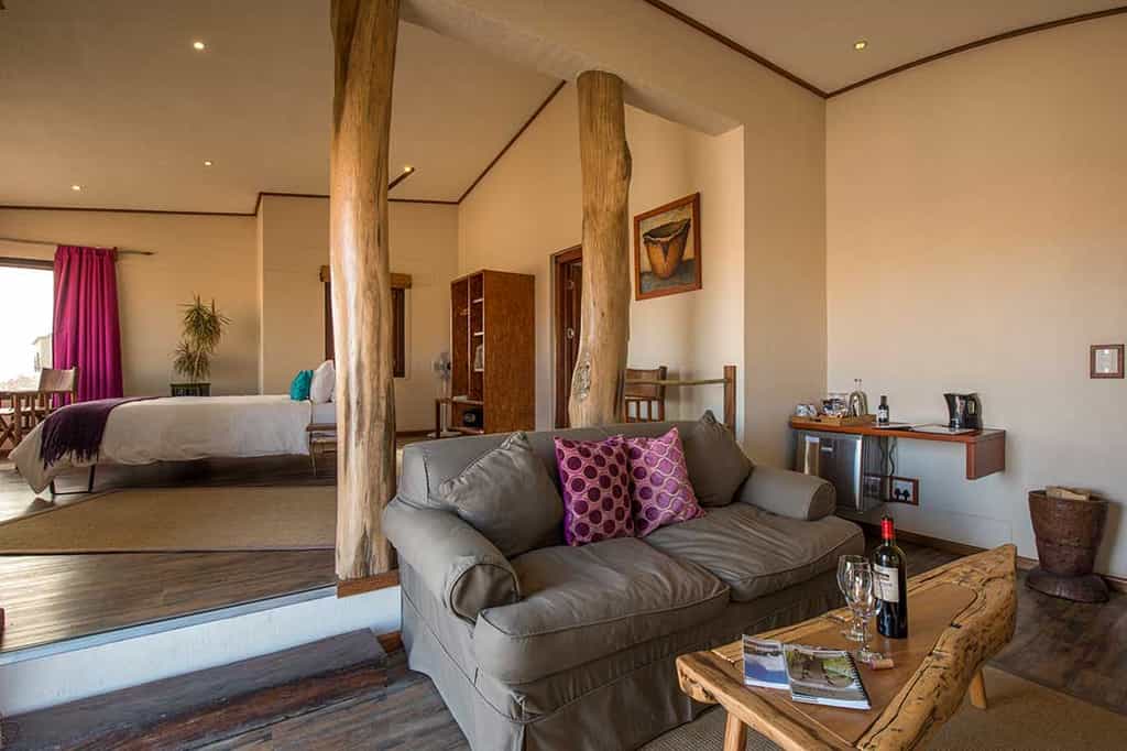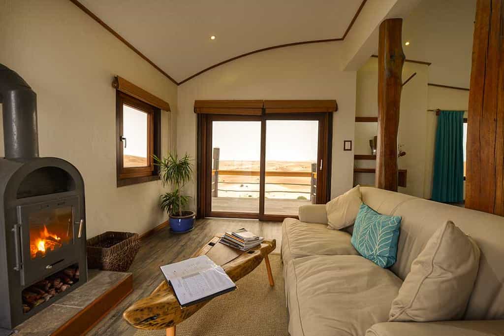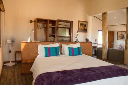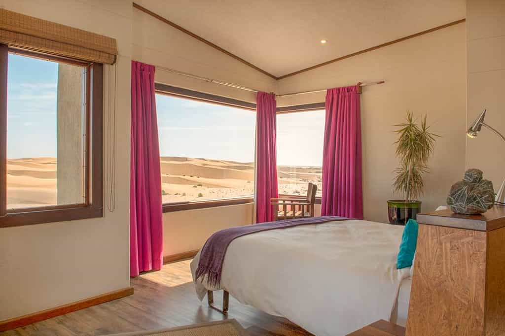 The lodge's twelve double or twin bungalows and three-bedroomed villa all boast fabulous desert views, each with big windows and a private balcony. From the outside, curved rooftops and rounded walls mimic the undulating dunes, and vibrantly coloured wall panels contrast the subtle desert tones. Inside, retro art and eccentric finishing touches add a sense of fun to the spacious, comfortably furnished rooms. Each is en-suite, with a homely sitting room, charming wood fire for winter warmth and ceiling fans for the searing summer heat.
