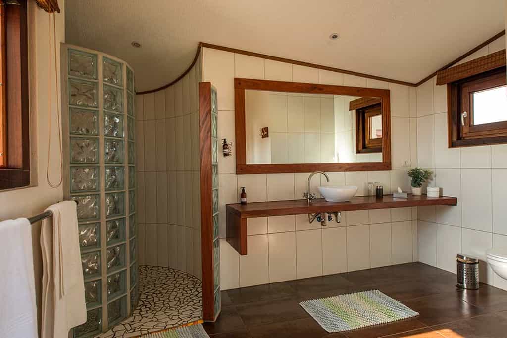 The roomy, open-plan lounge and dining area is perfectly positioned for expansive desert views, with huge full-length windows, polished stone and timber floors, and comfortable leather couches. An indoor breakfast room and outdoor terrace make the most of the staggering vistas and sense of space. Huge slabs of rock, chunky wooden pillars, contemporary colours and quirky hand-crafted furniture blend together to create a comfy and peaceful haven in the middle of the stark desert landscape.
