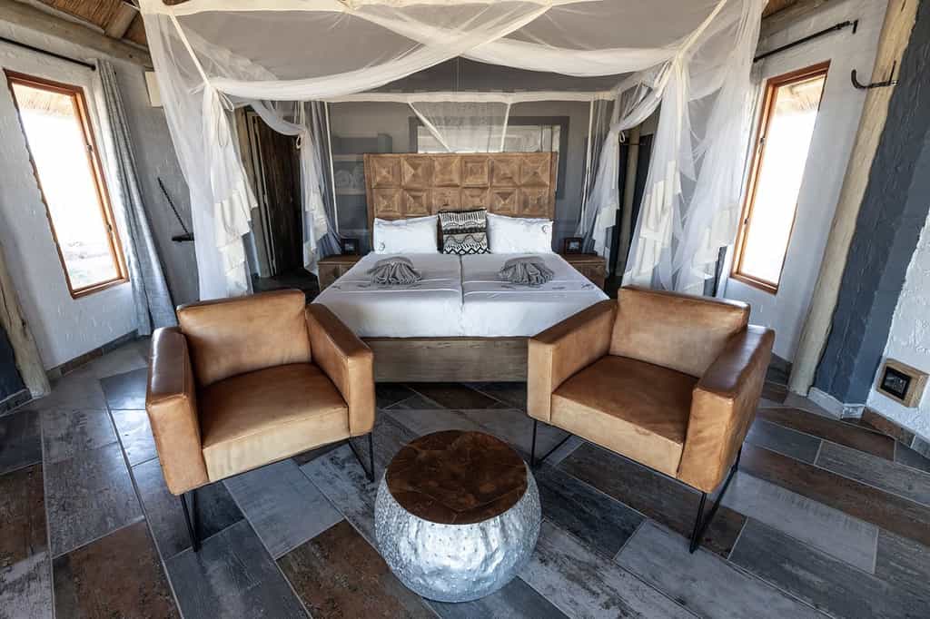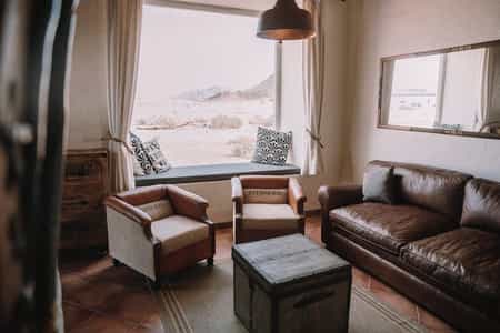 The main building is a contemporary take on a stud farmer's manor house. Comfortable and airy, the open-plan guest areas contain a spacious lounge and cosy library, bar and dining room where a roaring fireplace keeps the desert chill at bay as you tuck into hearty, farm-to-table cooking. The wraparound veranda is where the magic happens – settle into one of the leather sofas with a local wine and watch the light play across those impossibly wide horizons. The swimming pools provide languid refreshment after a hot day's riding, surrounded by mini bomas where you can just chill.