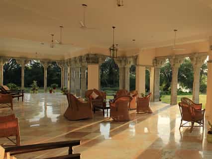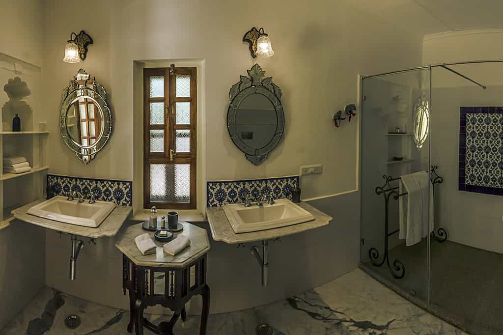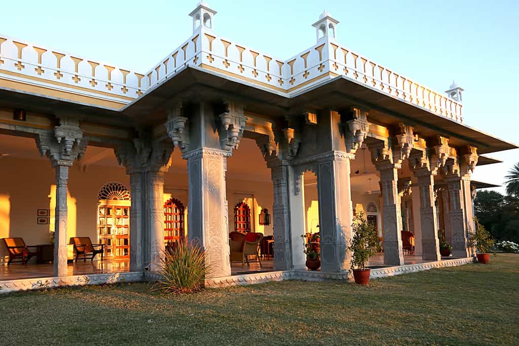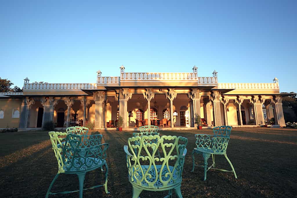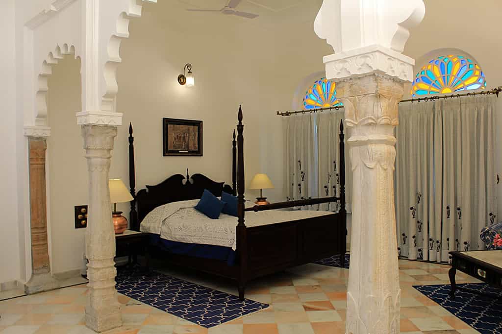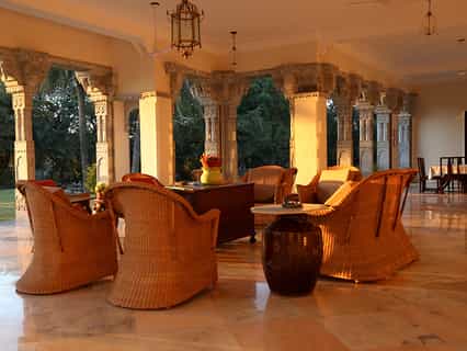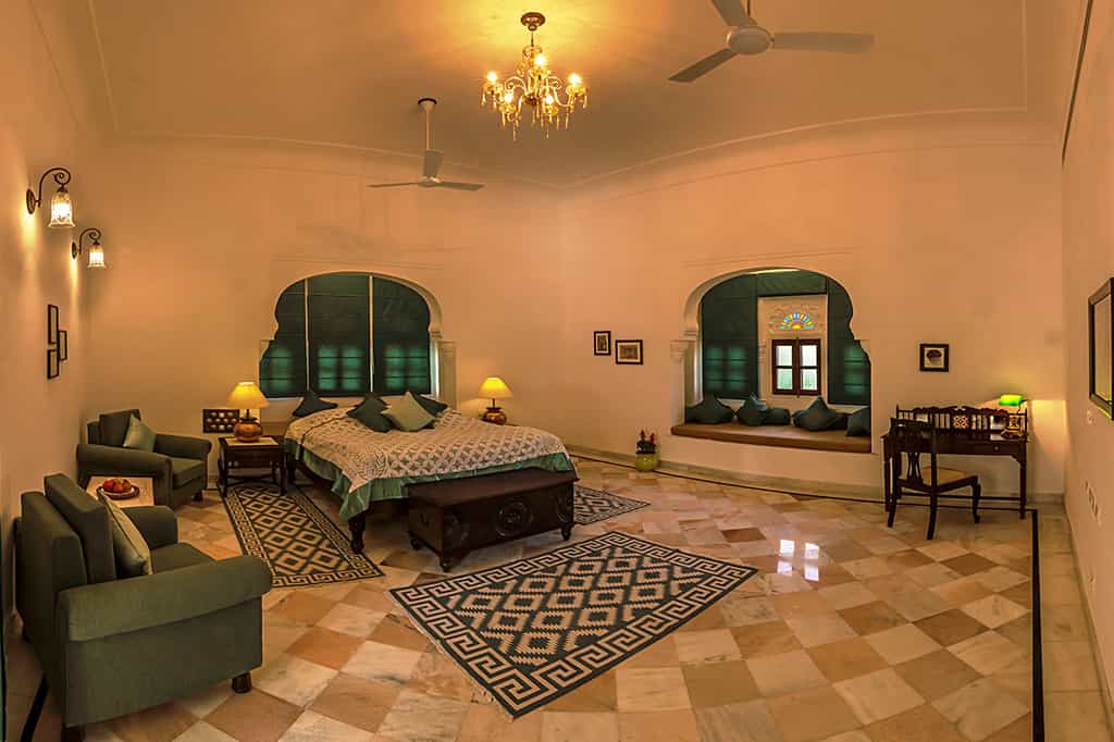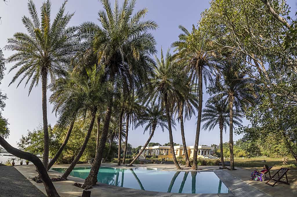The front steps lead past stone elephants onto the veranda which is decked out with wicker chairs and a sunny, central courtyard. With fresh ingredients from the kitchen garden, lunch can be enjoyed on the lawns overlooking the lake and home-style Mewari specialties are served in the casual dining room, accompanied by anecdotes from your hosts. Surrounded by swaying palms, the pool occupies a secluded spot in the garden and the spa room is at your disposal for a relaxing massage.
