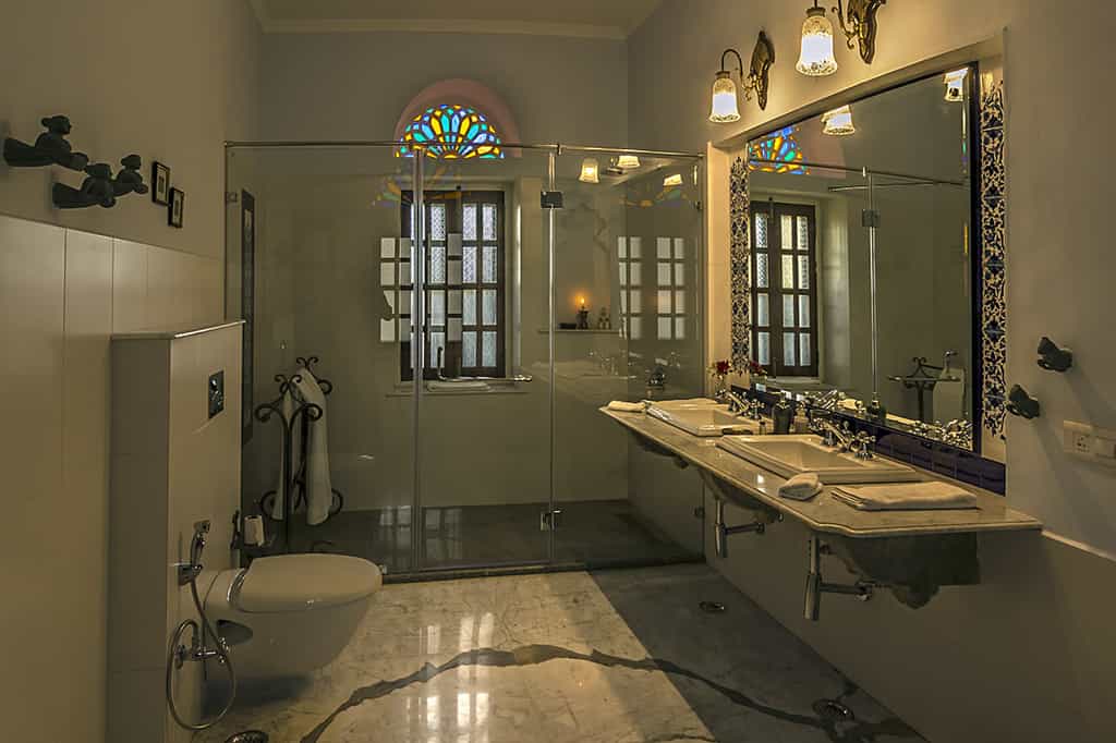 With simple but lovely decor, the seven spacious suites each come with dark wood furnishings set against red and blue silks, with patterned carpets. En-suite bathrooms are decked out with marble counter tops and ornate mirrors, with Kama Ayurveda toiletries for your use. Each room has twin or king beds, cushy window seats, a writing desk and sitting area. Other amenities include a mini bar, pillow menu and tea/coffee facilities.
