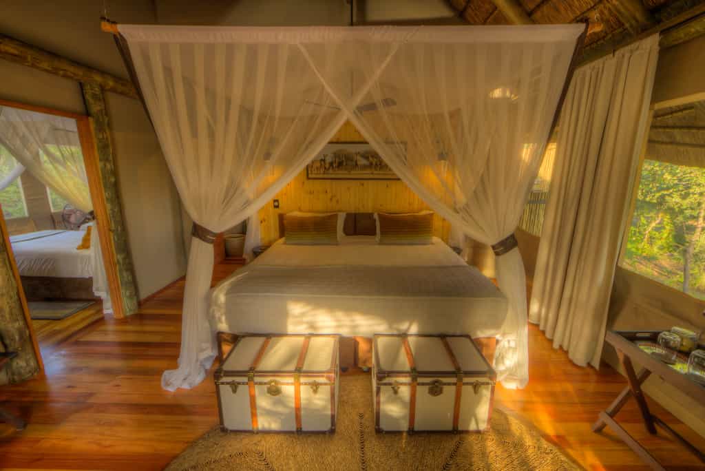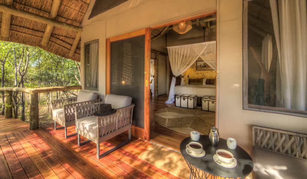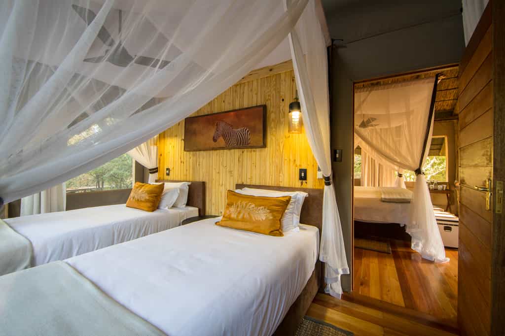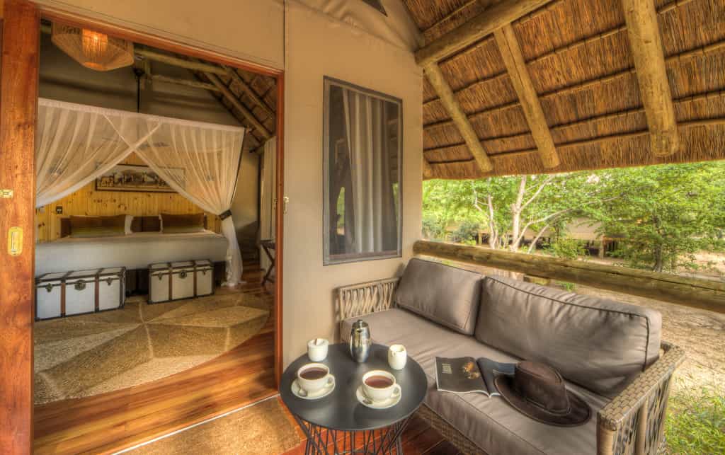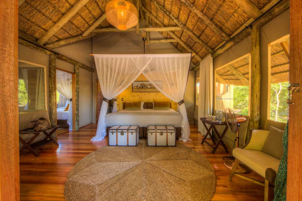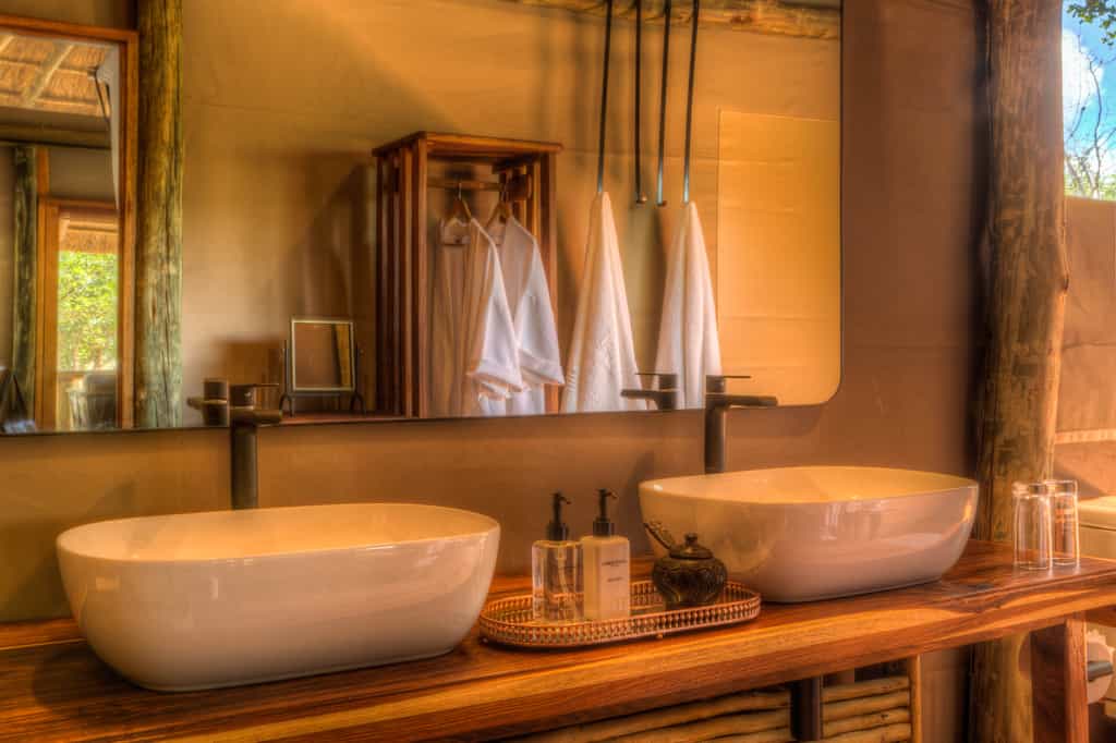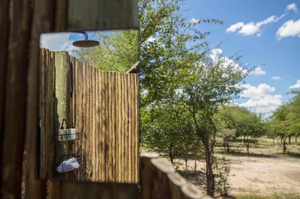Seven spacious safari-style tents are connected to the main area by wheelchair-friendly walkways. The tents are well spaced and raised on wooden decks overlooking the waterhole. The interiors have comfortable beds, arranged as twins or a large double according to your needs, and en-suite bathrooms with both indoor and outdoor showers, hot and cold running water and flush toilets. For families, there's a two-bedroomed tent for families, sharing a spacious en-suite bathroom. There's a splash pool for cooling off.