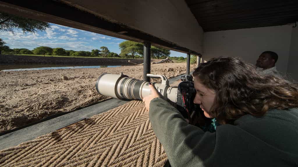 You're guaranteed gorgeous views wherever you are at Dinaka. The large and spacious dining room, roofed with cool thatch, has a long table for a warm, communal atmosphere. It's a good place to get to know the other guests and share your experiences over a good meal and a glass or two of wine. The seating area, with its comfortable chairs and calming desert colours, is open-fronted to the views and the waterhole. You could sit there for hours...