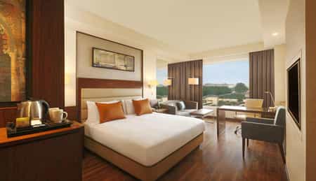 DoubleTree by Hilton Agra is a contemporary 5-star hotel located just minutes from the Taj Mahal, offering both luxury and convenience for travelers. The property features modern architecture, stylish rooms, and extensive amenities, including a rooftop pool, spa, multiple dining options, and meeting facilities. With its prime location and upscale services, it provides a comfortable base for exploring Agra’s historic sites while enjoying world-class hospitality.