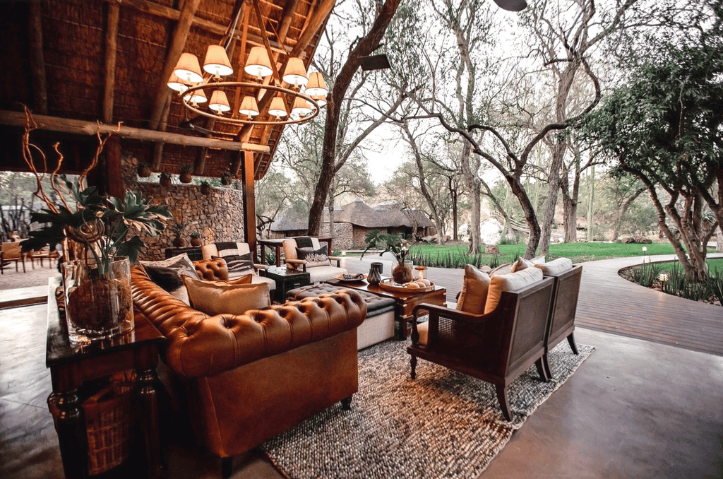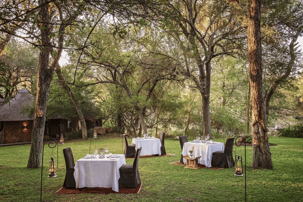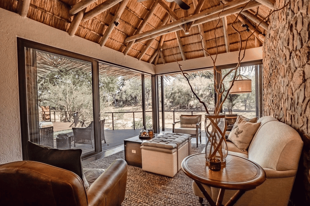 Natural hues, polished stone floors and robust timber elements have been skillfully used to marvellous effect. Towering jackalberry trees and cool thatch provide shady spots throughout the guest areas, with quiet corners on different levels to enjoy a drink and watch wildlife coming down to the river. A large swimming pool is an enticing option during the intense summer heat. Delicious meals are served in the open-air dining room, or around a crackling fire in the boma under the stars.