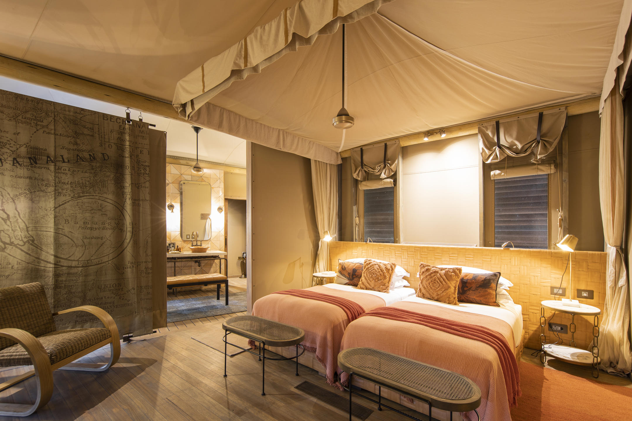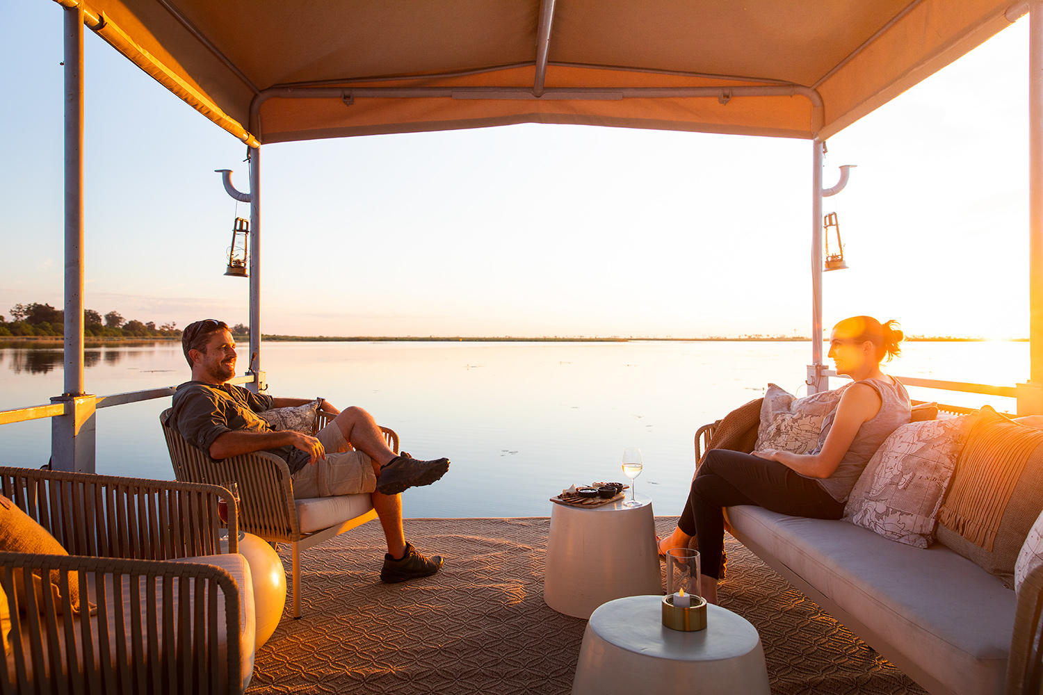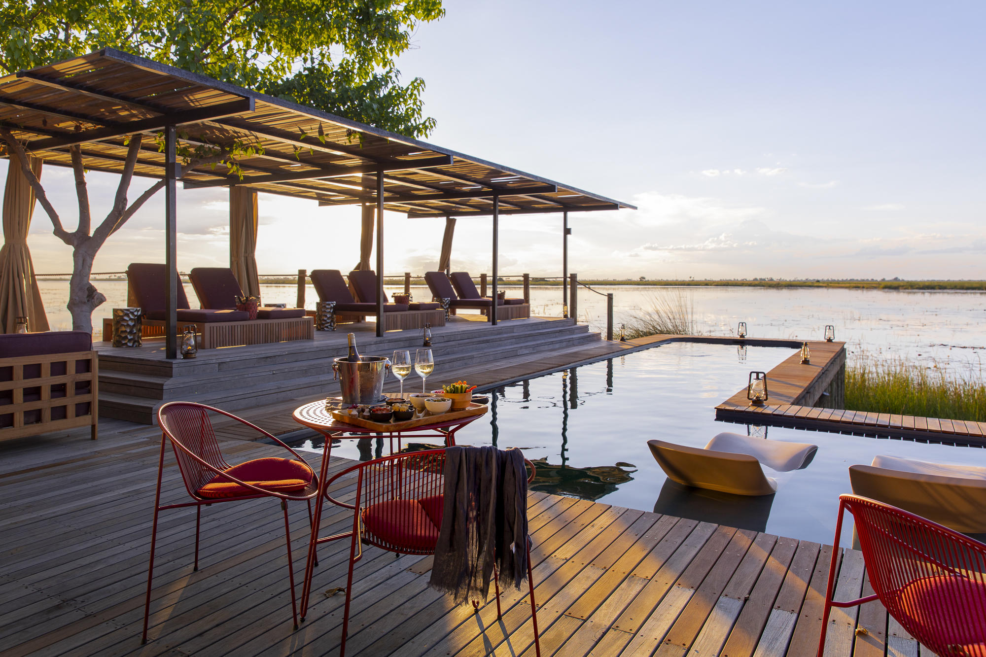 Duma Tau’s sprawling communal areas are set in two adjacent tents, with comfortable furniture that is laid out in a way that makes it both sociable and private. There are campfires at both the secluded waterside area and the floating deck, where evening sundowners are enjoyed with a side serving of natural beauty. The conveniently positioned plunge pool offers instant refreshment, night or day. The decor is luxurious yet rustic, with light wood and natural finishes, a wonderful collection of historic artifacts that attract the interest of many a curious visitor.
