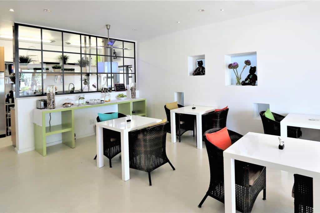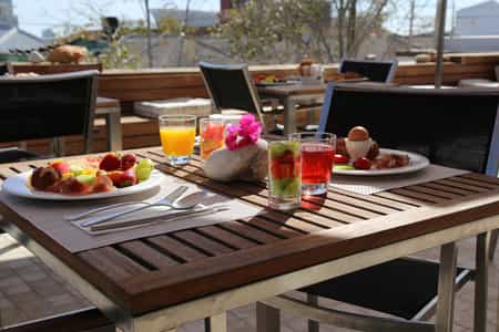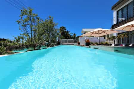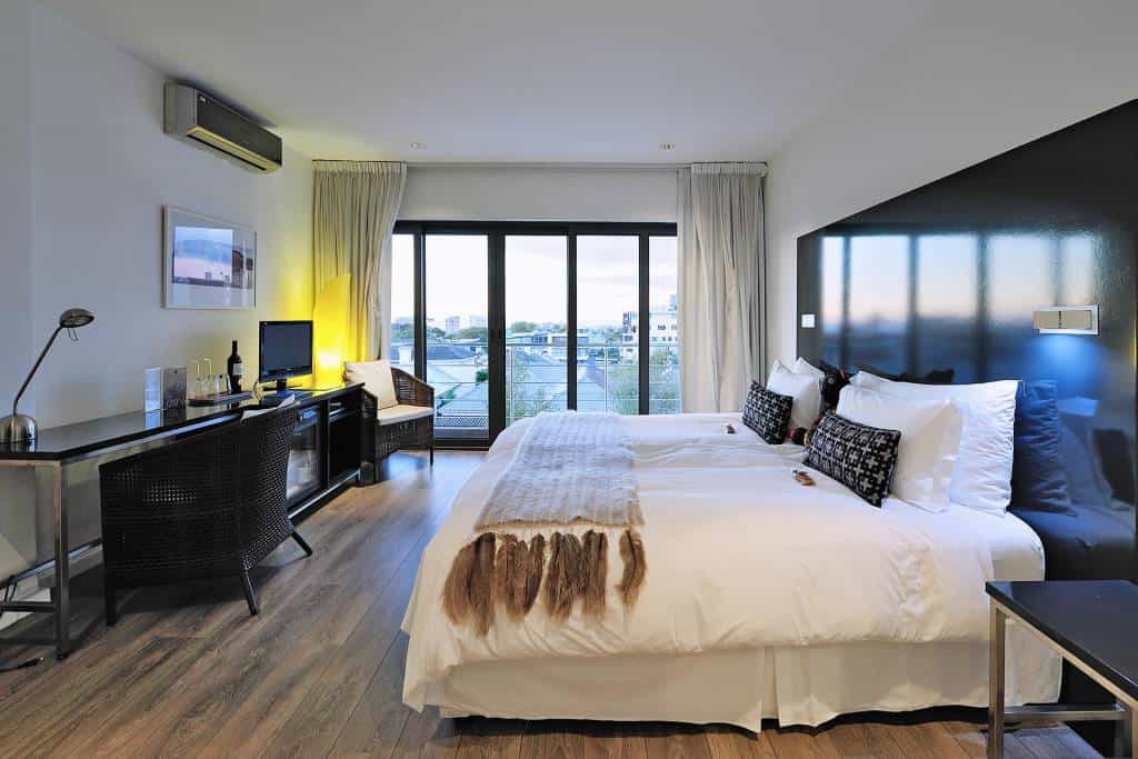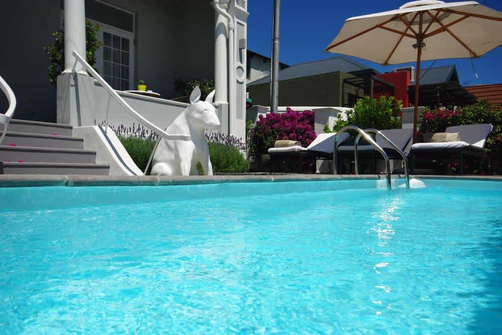 This double-storey hotel sits off the main road on a residential street. Its setting is undoubtedly urban, yet decidedly serene. Interiors tend toward a palate of blacks and whites, featuring eye-catching pops of colourful art which suggest both the good taste and good humour of the owner. The two lounges feature clean lines and varying textures; think leather sofas and cow-skin rugs. Windows separate the kitchen from the breakfast area, which is home to a plentiful morning buffet and several tables for two. Outside is a covered patio that stretches the length of the hotel, populated with plenty of seating in front of the lap pool, which glows sapphire at night.