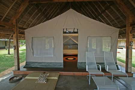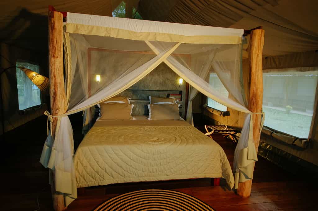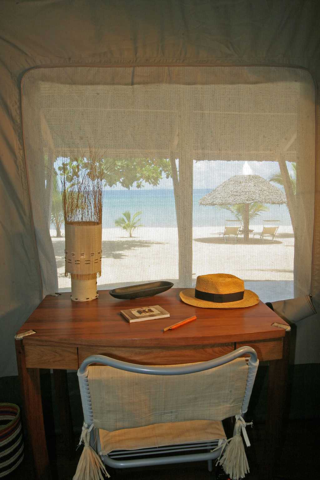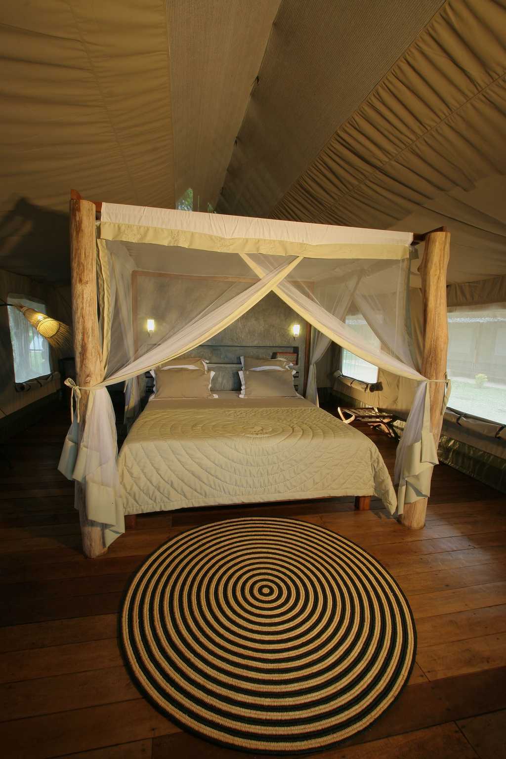 The eight suites – spacious safari tents protected by timber-framed structures made of local materials – all face the sea and lie no more than 25 metres from the water's edge. Air flows freely throughout the suites, which have large openings protected by mosquito nets and, indoors, king-sized beds and an en-suite bathroom with shower. Each has a private terrace, where you can enjoy a massage, and a balcony on which to enjoy the ocean view.