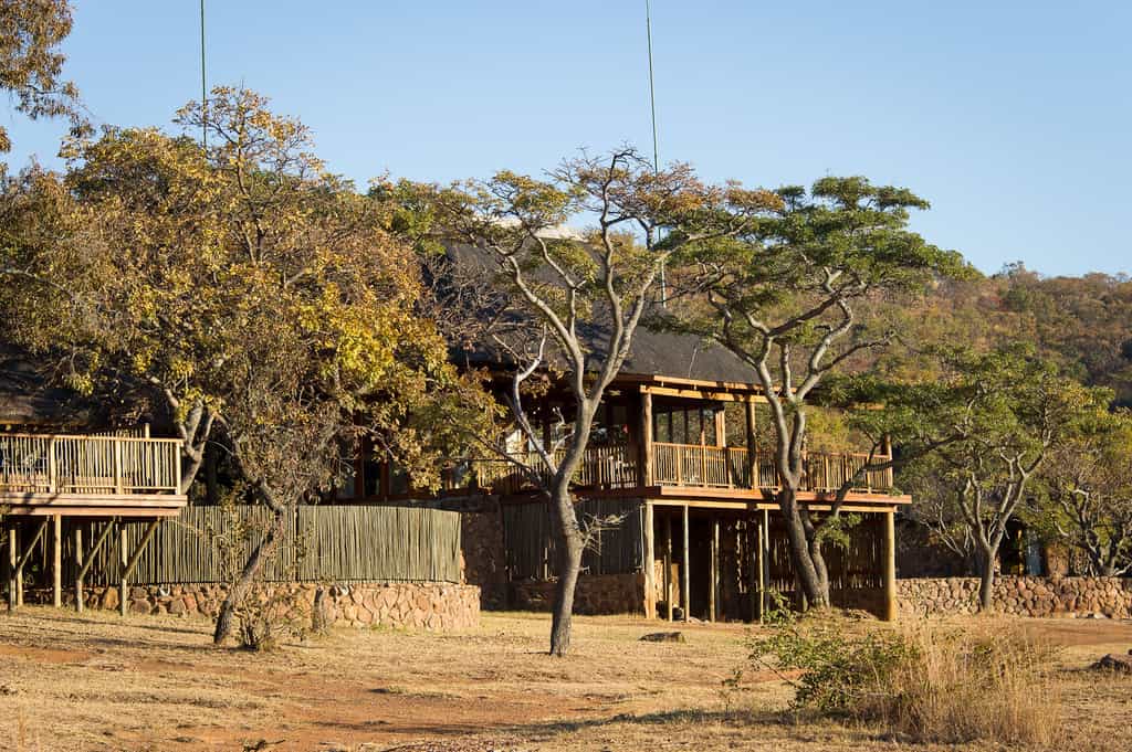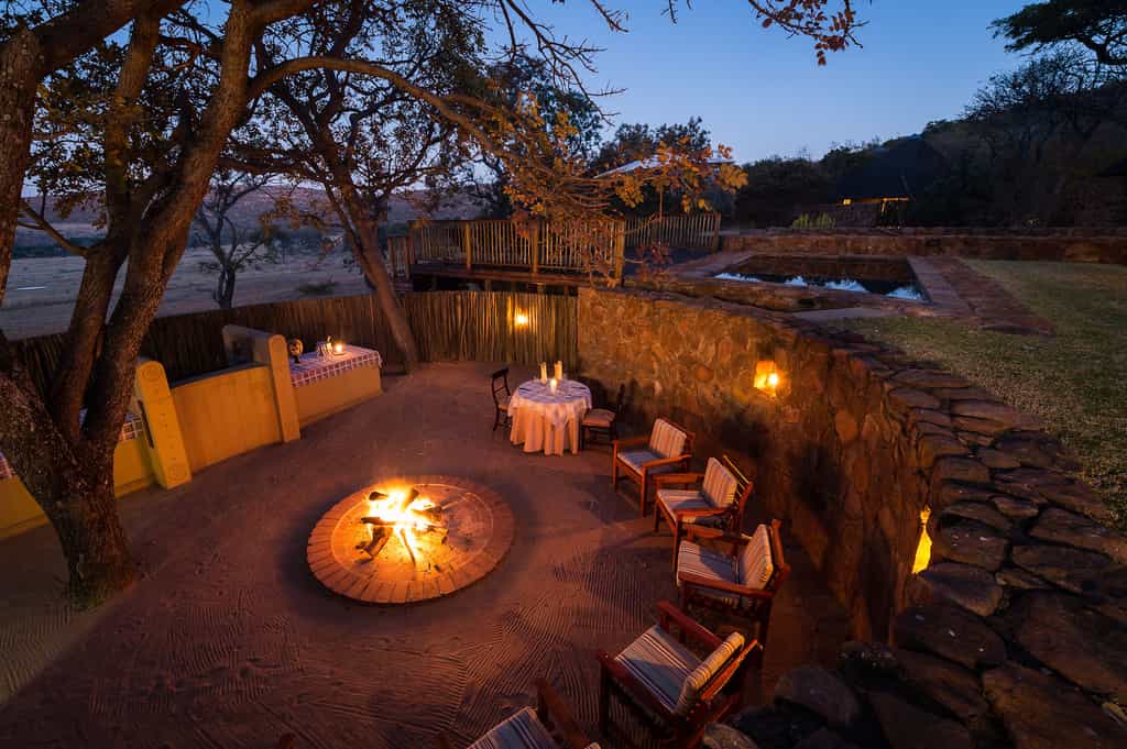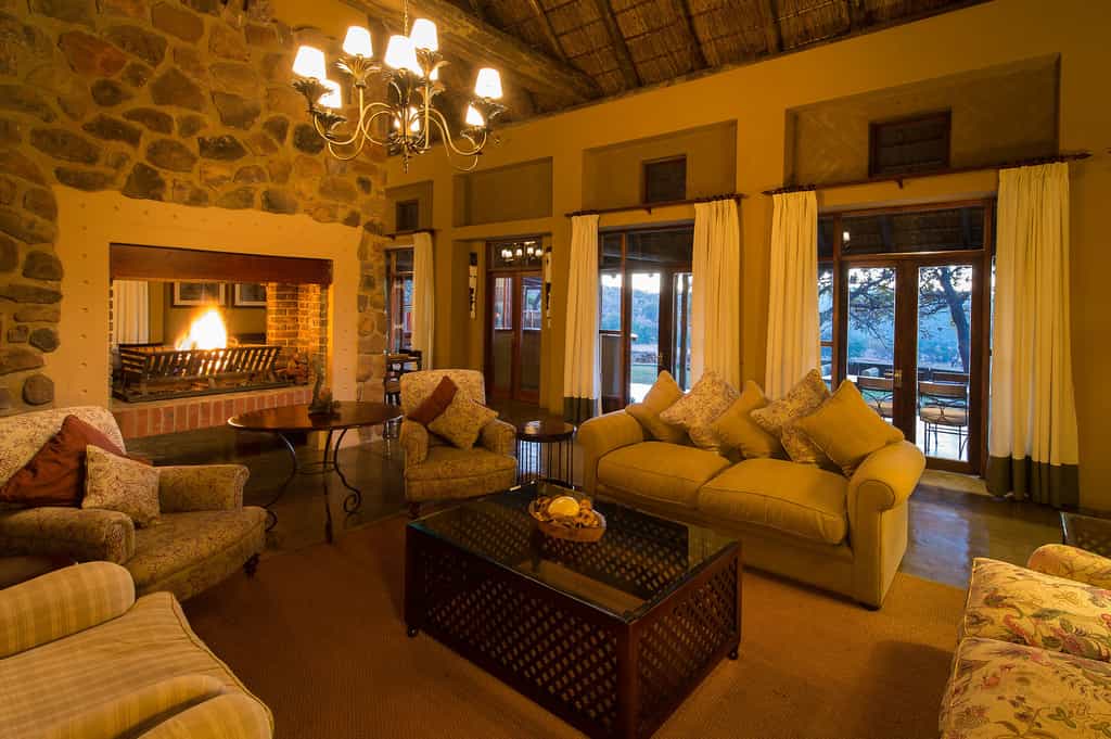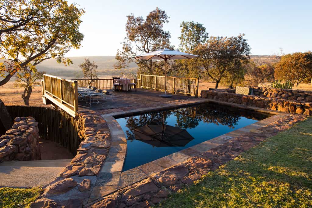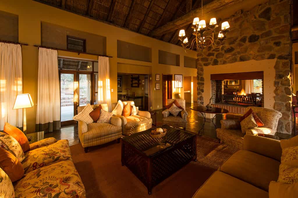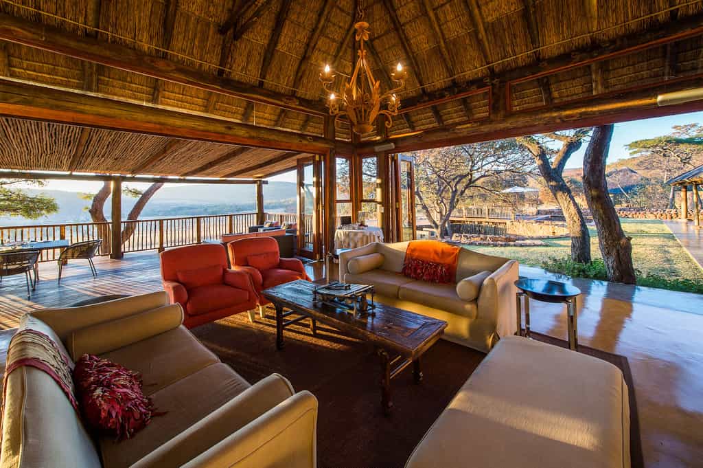 Ekuthuleni Lodge has sweeping views of the savannah plains, from the main lodge, the bedrooms and the swimming pool area. The main lodge has an elegantly furnished casual lounge and dining room, and includes a large central fireplace which creates an intimate, cosy atmosphere on chilly winter nights. Meals can be enjoyed in the dining room or on the open air deck, which has a reed awning for shelter. Cobbled pathways lead to the exclusive and private chalets.