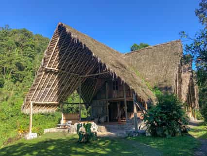 Using local materials, the lodge is mostly built from wood and bamboo, with open-plan spaces positioned for the ultimate view. In the main house, there is a cosy dining area and free-form kitchen where the chefs whip up colourful dishes from the ever-changing menu like tamales and seafood ceviches. In your down time, there is a river-fed pool and shelves of books to enjoy in the rustic lounge or whilst swinging idly in a hammock, and evenings are often spent round the fire.
