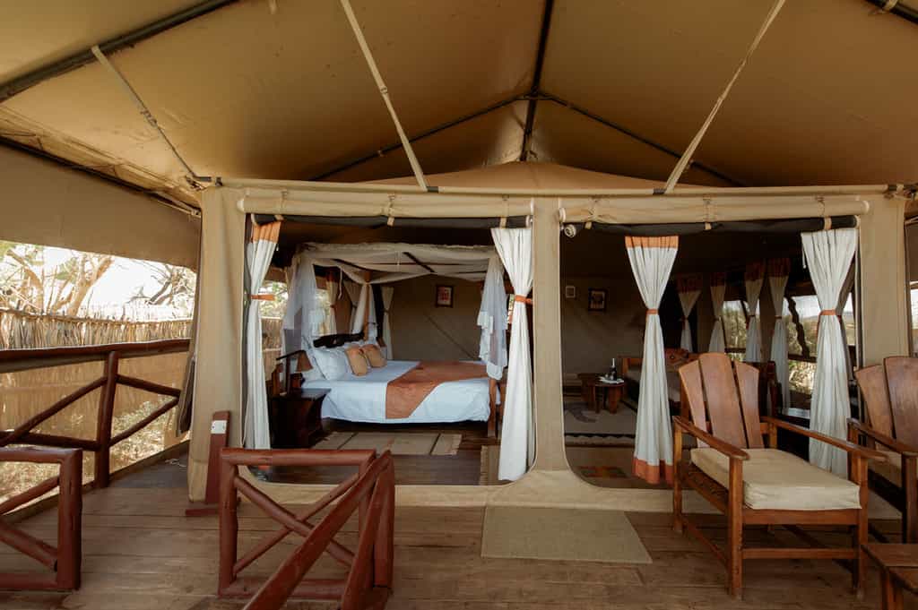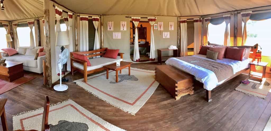 Elephant Bedroom Camp has just 12 spacious, double tents built on wooden platforms – four with king-sized and eight with queen-sized beds. Each tent is decorated in natural tones with splashes of rich colour in the soft furnishings. There's an en-suite bathroom, complimentary bath products and hot water, and a viewing deck with a private plunge pool, ideal for cooling off after a hot day under the African sun.