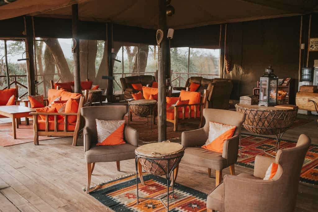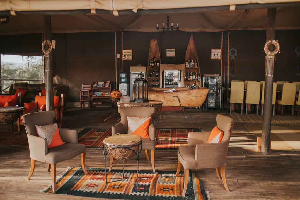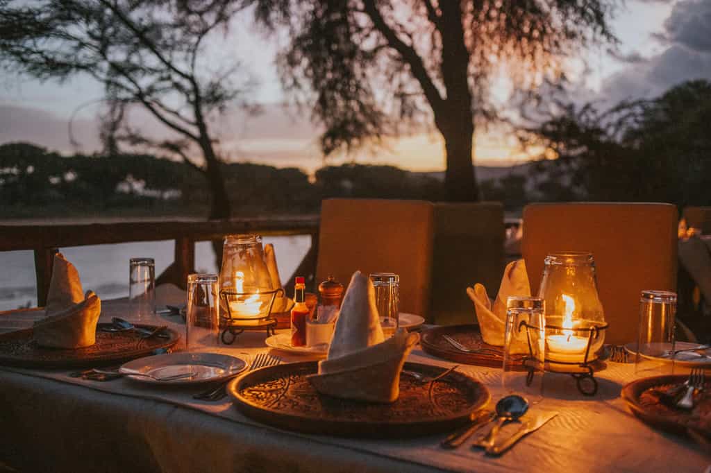 Shaded by towering trees, the slightly elevated lounge and dining areas are decorated in vibrant safari colours and lead on to a spacious veranda overlooking the river. Breakfast and lunch are served on the banks of the river; four-course candle-lit dinners in the dining room. Private meals can be arranged on request. The main area is an ideal place to unwind in the evening with a drink in hand as you listen to the sounds of the wilderness. Wi-fi available.