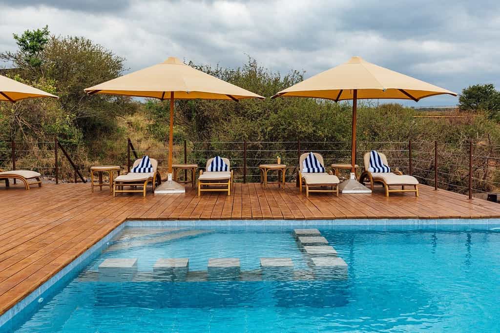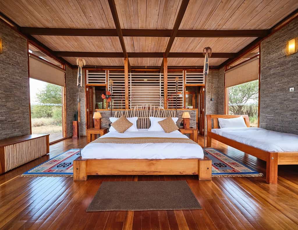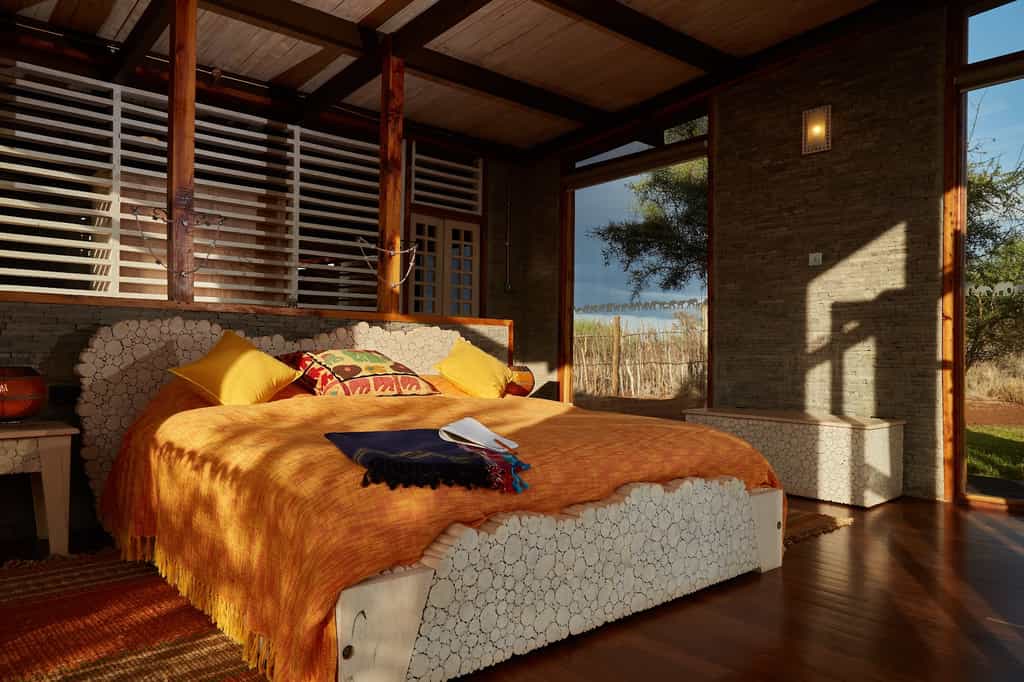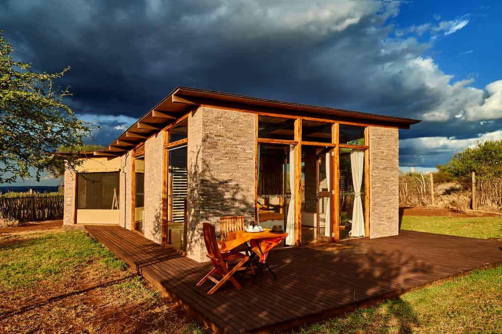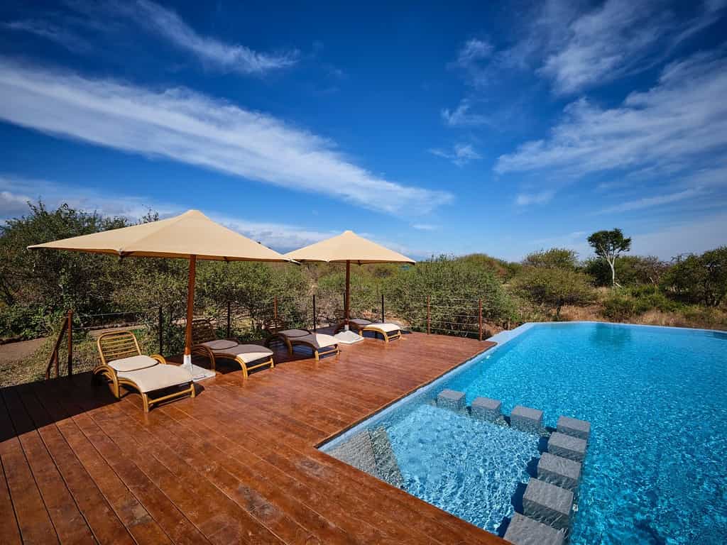 The double-storey main area capitalises on the vistas, sitting just above (and almost indistinguishable from) the buffalo thorn tree line. However, step inside and the colourful cushions and bright walls mean there's nothing subtle about this lodge's eccentric, fun ambience. The walls of the large open-plan lounge (built around a natural lava rock formation) are either glass or open to the breezes, with intimate seating areas and a broad deck. The bar is well-stocked; the dining room glows with colourful place settings, warm lighting at nightfall and starlit, alfresco dining if you fancy.