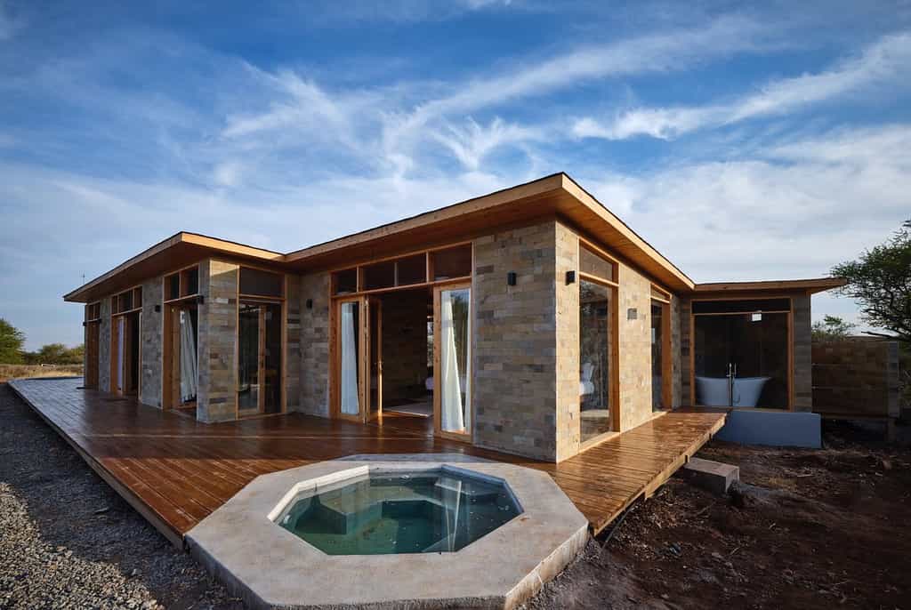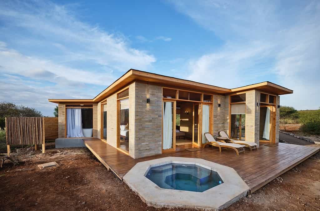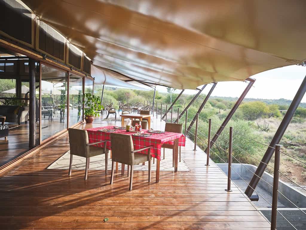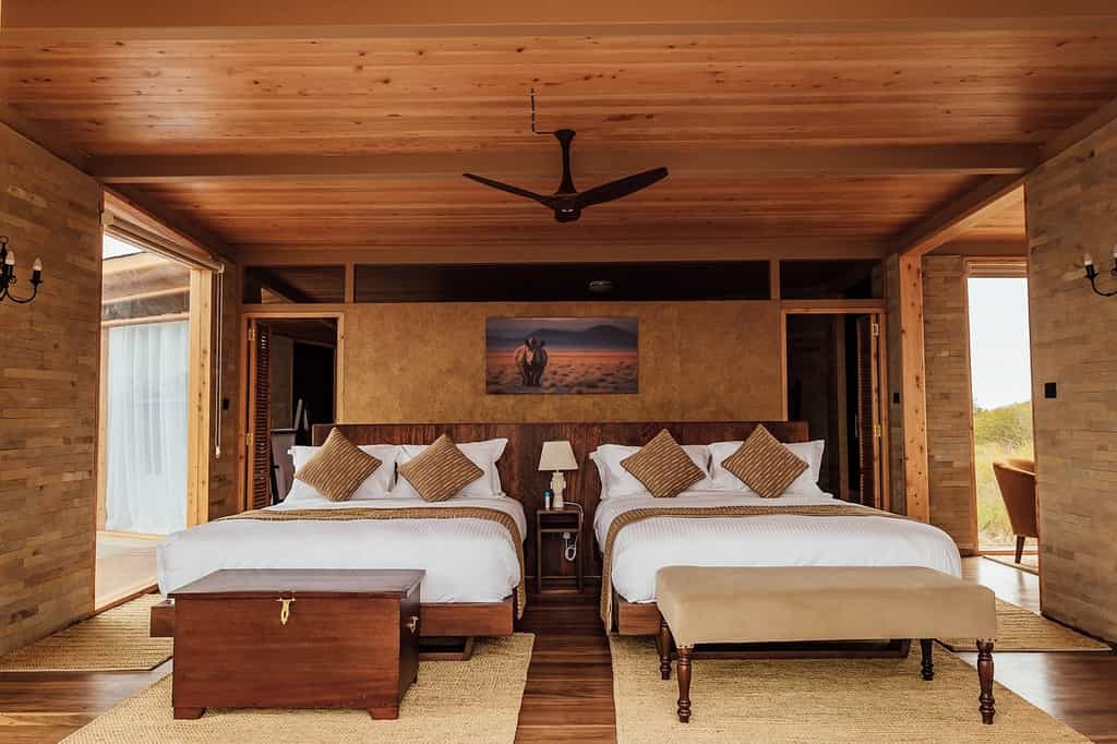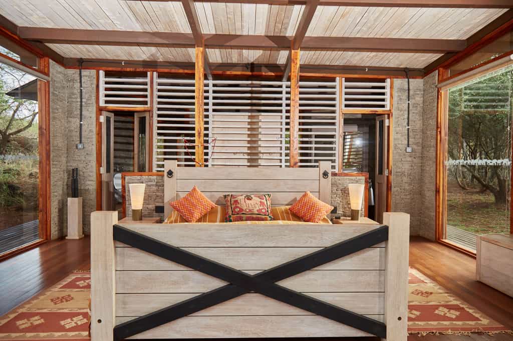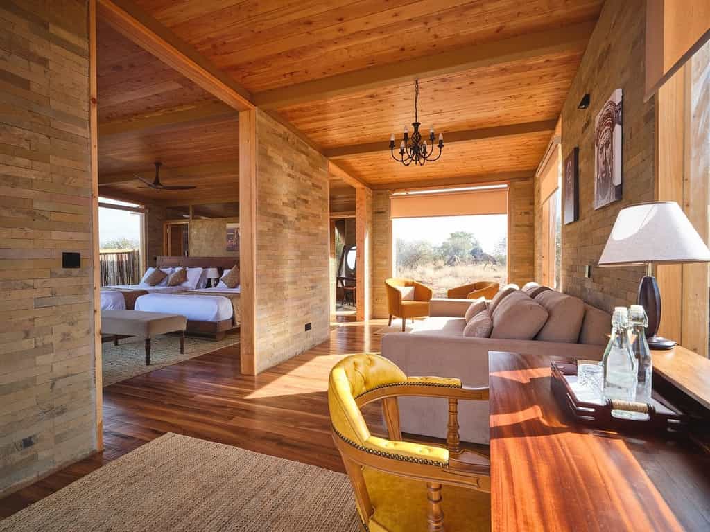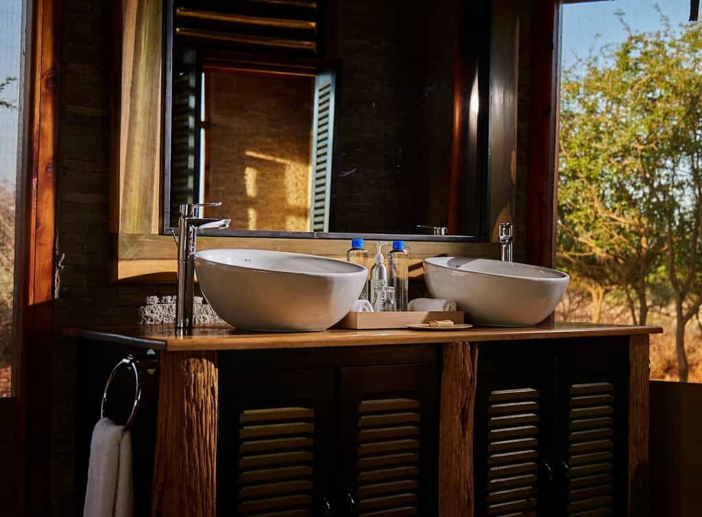 Each of the ground-level suites is spacious and modern, with floor-to-ceiling windows making sure you miss none of the wildlife action at the waterhole. The suites are built of stone and wood, so they blend easily into the landscape. The interiors, like that of the main area, have a personality all their own, though the clear focus throughout is to make the most of the views. Expect large double beds, a dressing area and en-suite bathroom with a double basin, a solar-heated shower and bath.
