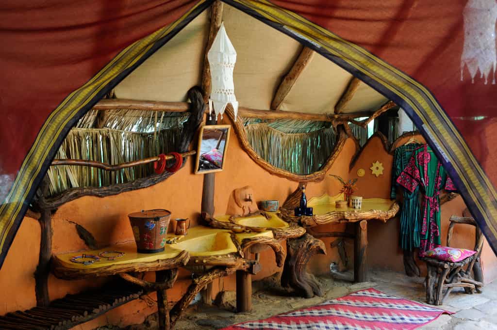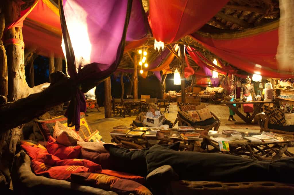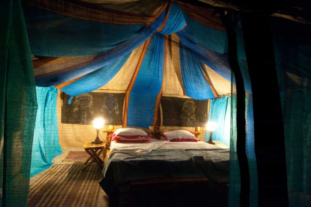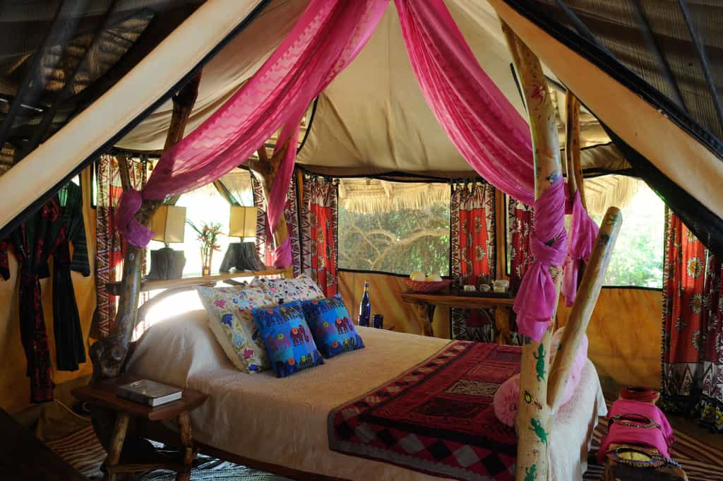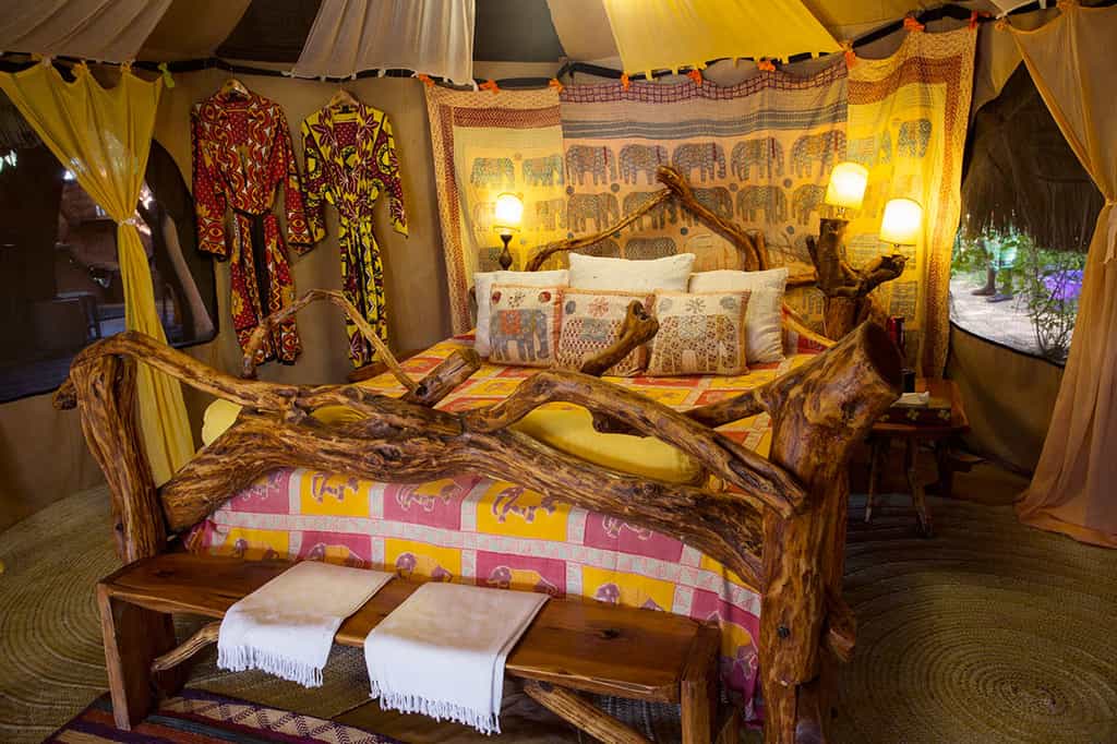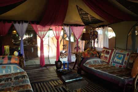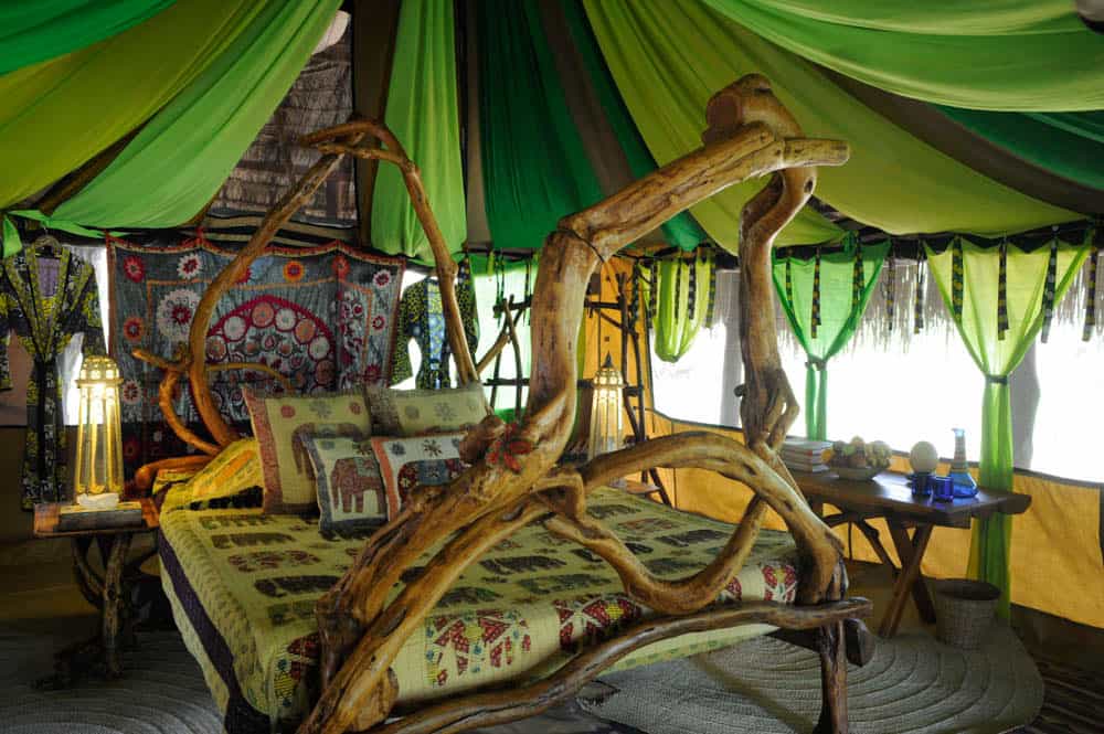 There are six thatch-covered tents, all decorated in a fusion of luxury African-style bush living and bedouin tent bohemian. The walls combine canvas and netting to keep bugs out but allow in the sounds and scents of the wilderness. Inside, flowing fabrics cascade to the floor, there's a king-sized bed with crisp cotton sheets, lamps, a flashlight, fluffy towels and storage space. The en-suite bathrooms are private, with a bucket shower that is filled with steaming water at night.