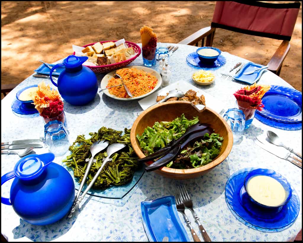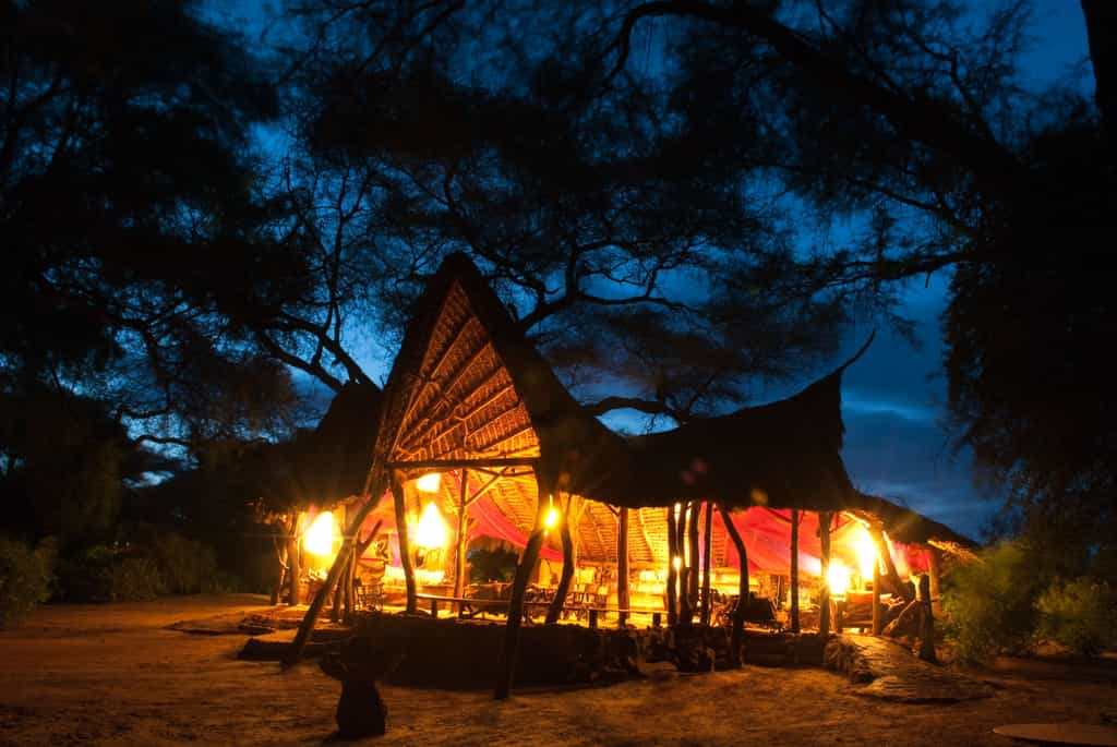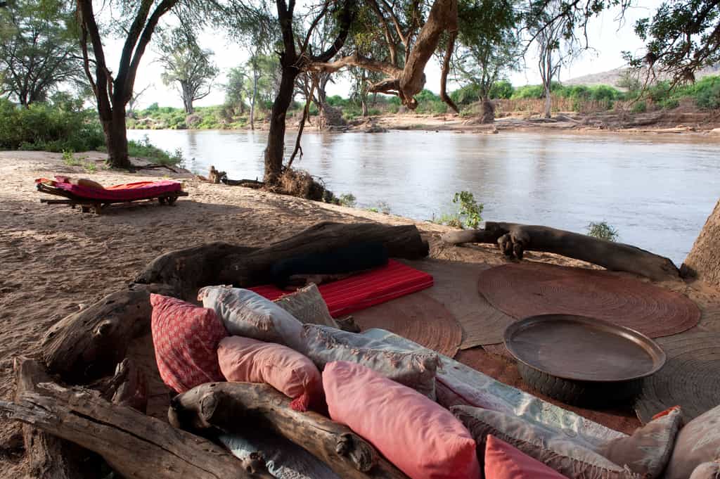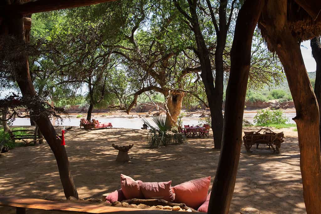 The communal area, like the tents, is built of fallen trees and colourfully decorated. Meals are served under cover or beside the Ewaso N'giro River, on whose banks the camp lies. The camp staff make all the food using locally sourced ingredients, so the Italian-meets-African cuisine is fresh and fabulous. Enjoy picnic lunches in the wilderness, and starlit dinners accompanied by the hooting of owls, a lone Samburu flute and the splash of animals in the water. Wi-fi is available.