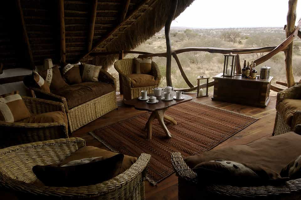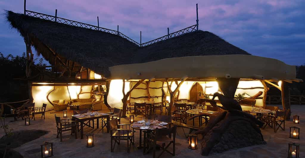 The main area is cleverly built among giant boulders, creating a flow that winds sinuously from indoor to out, and back again. Cross a small bridge above a fish pond that's surrounded overhung by weavers' nests to enter the bar and split-level lounge/dining room. Wind out again to the rim-flow swimming pool, reception and terrace. Upstairs is an observation deck with plenty of comfortable seating. Dinners are à la carte, and on a clear night, may be served outdoors.