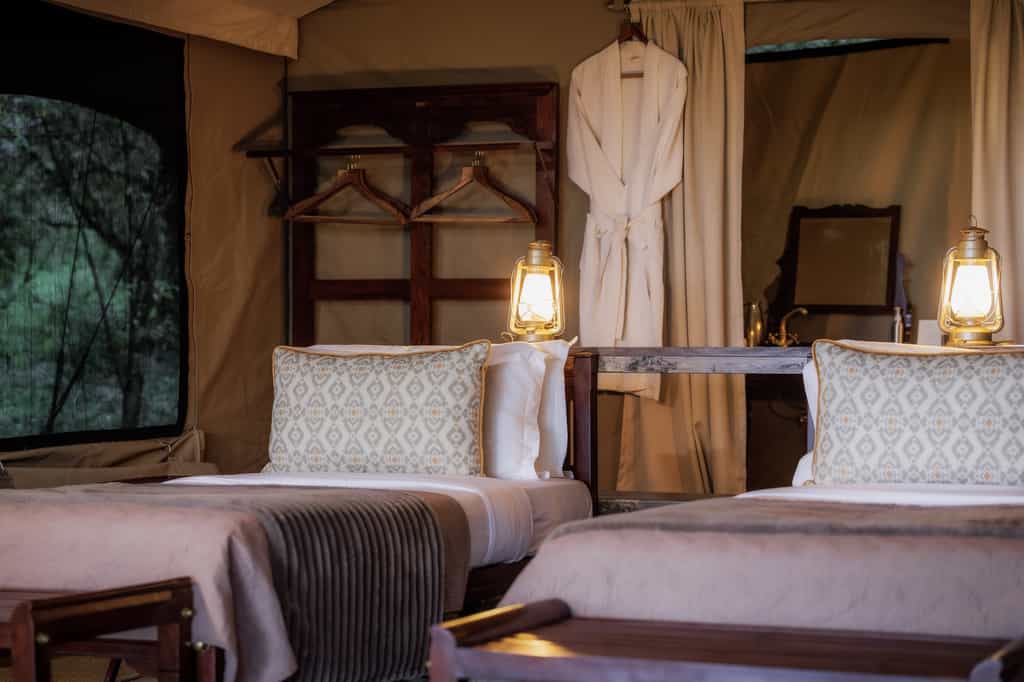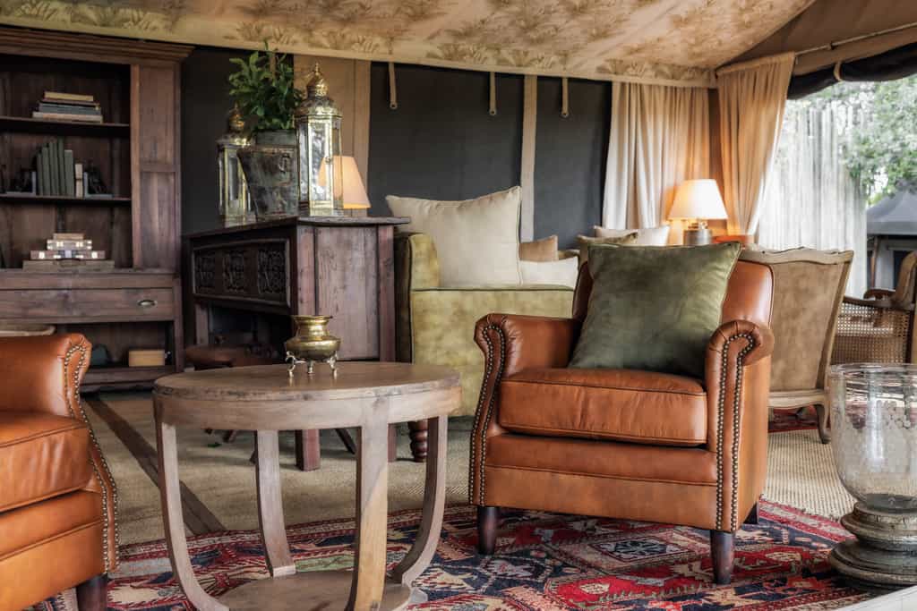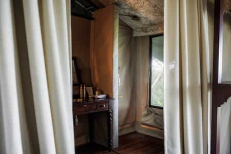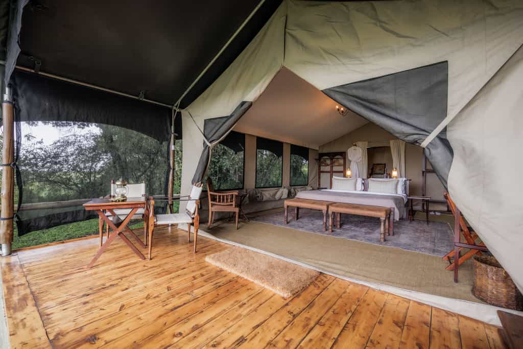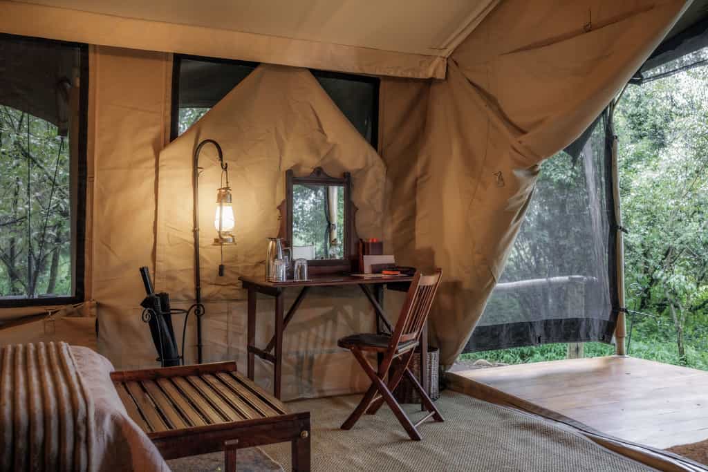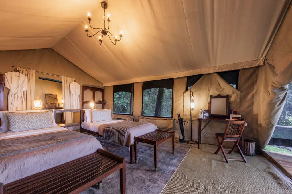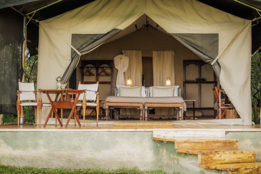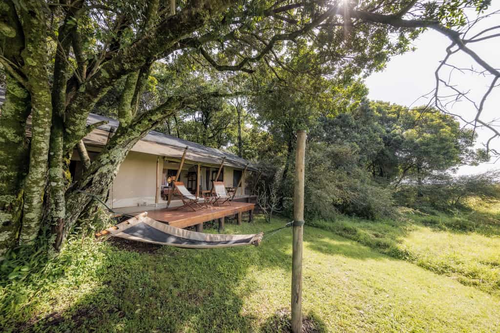 The tents may be entirely made of canvas, but it feels like stepping into a luxury hotel room when you enter. Windows roll up for endless views of the savanna from the king sized bed. A writing desk and dressing table remind us of how Hemingway must have experienced the bush in his day. Each tent has an en suite bathroom with flush toilet and safari shower and walks out onto a private veranda with a hammock. Bonus: there are two Honeymoon Tents that can be used for families with little ones.