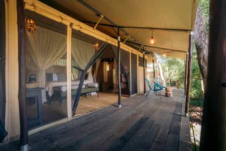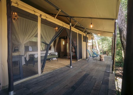 Emboo's revamped main area is a classic Meru-style, open-sided tent tucked into the tree canopy. Inside, all is modern, with gorgeous new hardwood furnishings and a real sense of traditional safari with a touch of class. The focus of the structure is clearly everything out there. You'll dine at a long candle-lit table as hippos grunt in the river below, then gather around the camp fire, sharing stories and listening to local tales, or silently gazing at the stars.