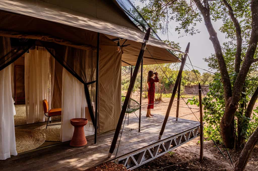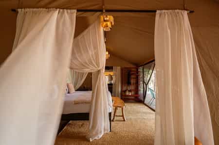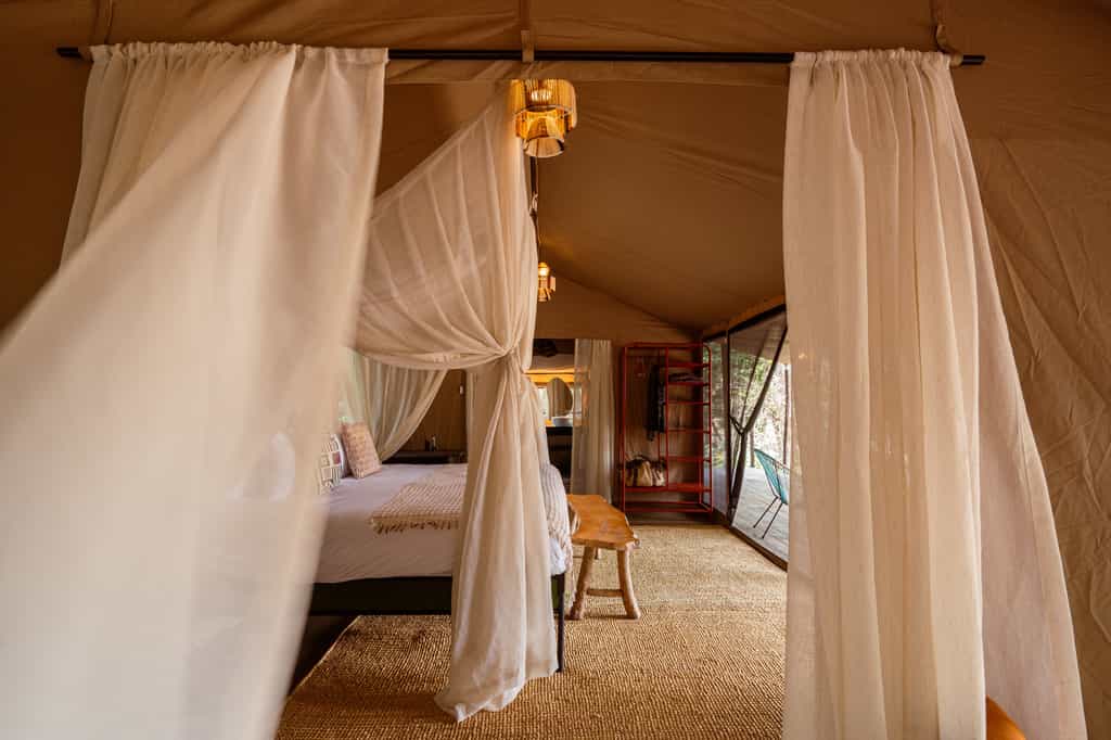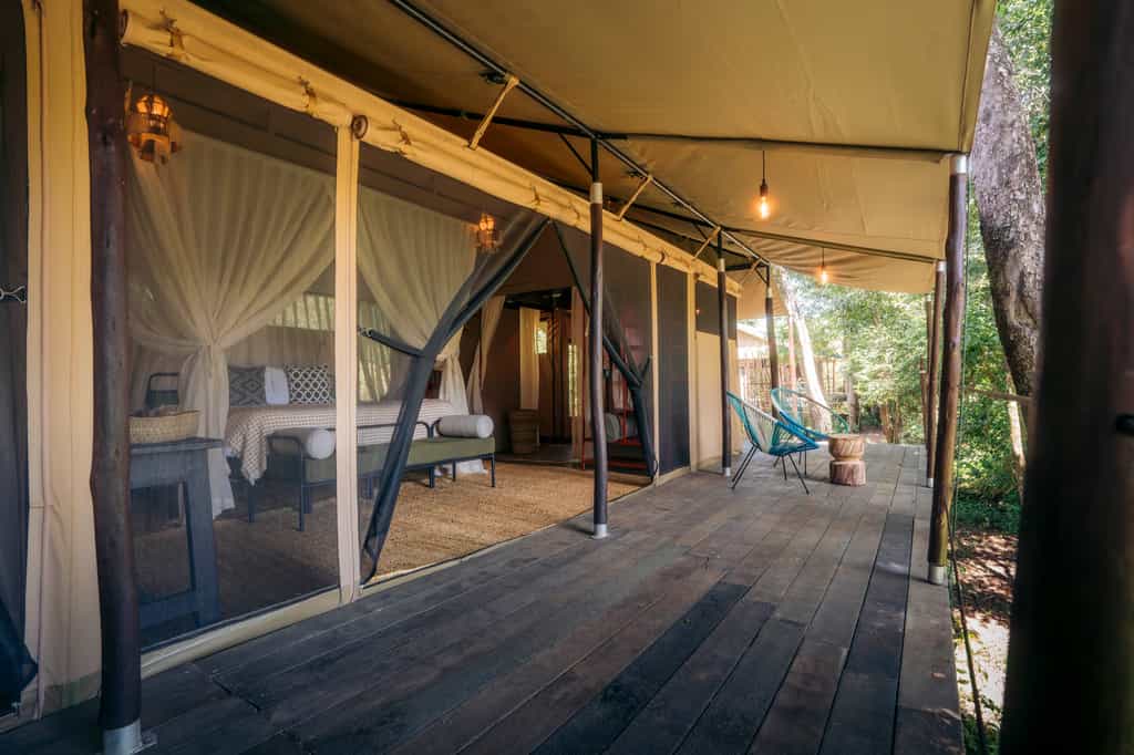 Tents hug the edge of the river, with wide front porches to take it all in. The structure is basic, with canvas ceilings and foldaway doors, and large mesh windows on three sides. At the heart of the space is your bed, fitted with quality linens and mosquito netting. There are a few rustic furniture pieces and some pretty handwoven rugs. Soft but very adequate lighting is supplied through solar panels, as is the hot water for the rain showers.