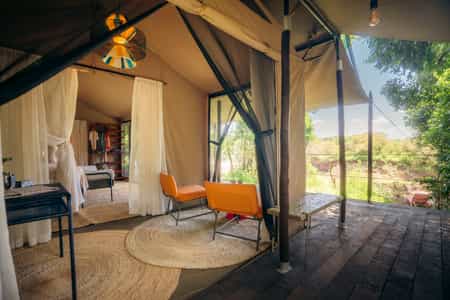 Game drives can keep you camera-clicking from dawn to sundown, and the guides are keen as mustard to help you maximise your visit. The migration holds centre stage, especially as there's a crossing so close to camp. (The predators that follow the action make for great viewing!) The sheer variety of species here is remarkable, from the Big Five to wild dog, hyena, giraffe – the list is long. In between wilderness drives, you can plant indigenous trees, join the Chefs in the hydroponic farm, explore the Mara on foot with the rangers of Mara Elephant Project, gather around the campfire for Maasai storytelling, test your speed on the first running track in the Mara, cool off in the pool or unwind at the bush spa, take adventure higher with a hot air balloon safari, experience Maasai culture with a village visit or try warrior training, learning survival skills like rungu throwing and archery.