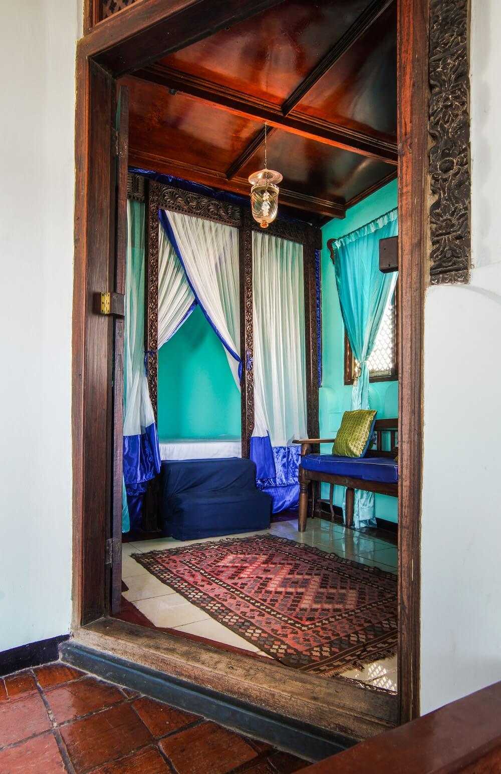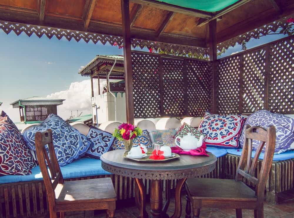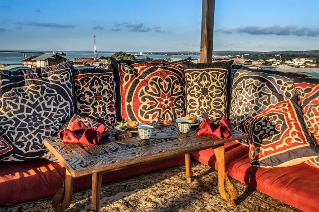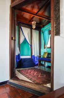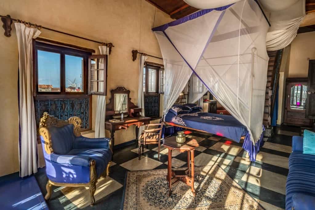 The 17 air-conditioned bedrooms epitomise romance, with antique netted Zanzibari beds, rich jewel-like fabrics, glass chandeliers, hand-painted window panes, large stone baths and open-air verandas offering views across the city. The rooms range in size from standard to deluxe suites, the latter equipped with private tearooms and plunge pools. The nine standard rooms are lovely too, with their antiques and en-suite bathrooms, and offer great views thanks to their open sides.