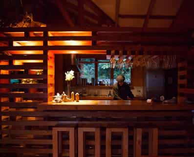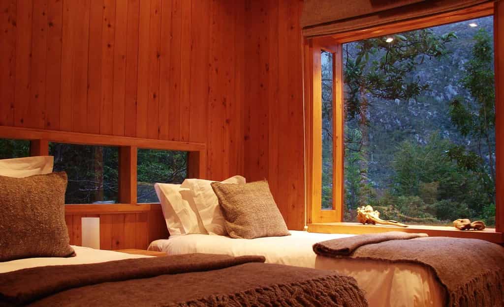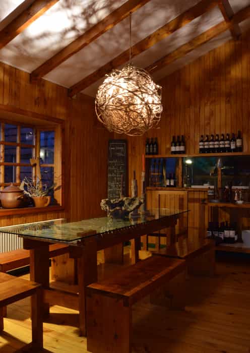 Built entirely from honey-coloured Guaitecas Cypress, the hotel lounges are often aglow with firelight and offer the perfect setting for diving into the collection of books or admiring the many photographs on the walls. Cooked by a chef during the summer and Maria throughout the rest of the year, traditional Patagonian dishes are served in the intimate dining room. Every ingredient is locally sourced including the breakfast preserves, which are made on-site. For something different, try the spit-roasted barbecue, washed down with a craft beer.