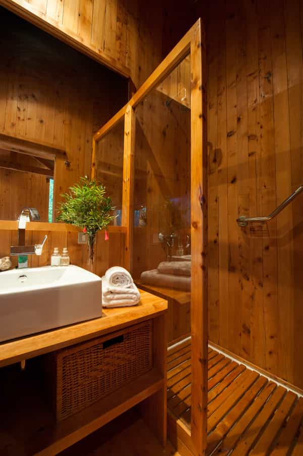 There are just six rooms at Entre Hielos, furnished simply but snugly with double or twin bed complete with goose feather duvets and wool blankets, hand-woven wall hangings, and baskets to hold your clothes. Huge, unbarred windows reveal an incredible view over the jungles of Caleta Tortel. Each room has an en-suite bathroom with wood and glass showers, and neat amenities. The rooms are all kept comfortable with central heating too. The hotel has scheduled hours without electricity and TVs aren't a feature.