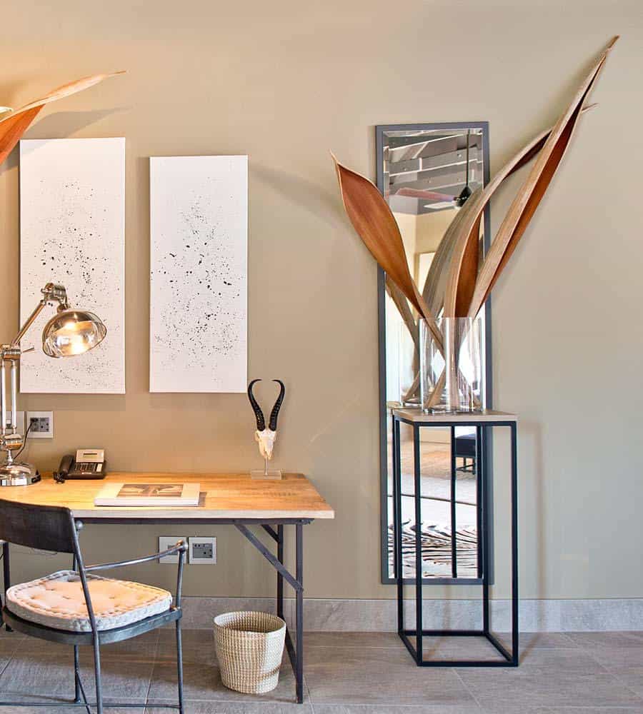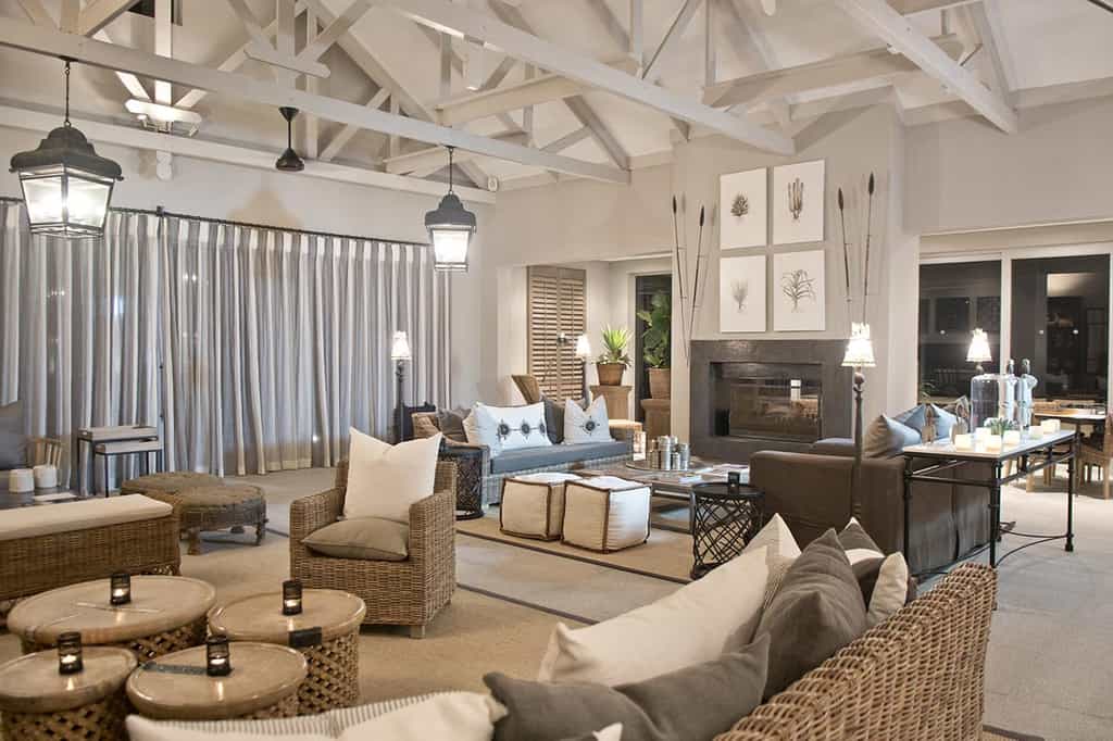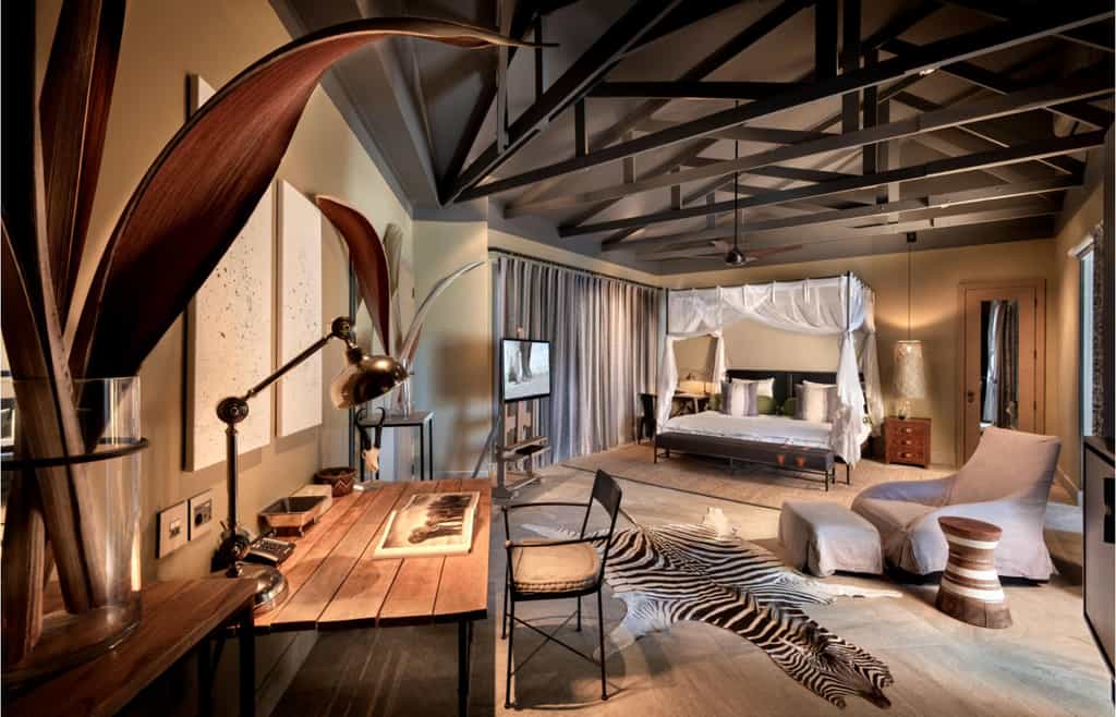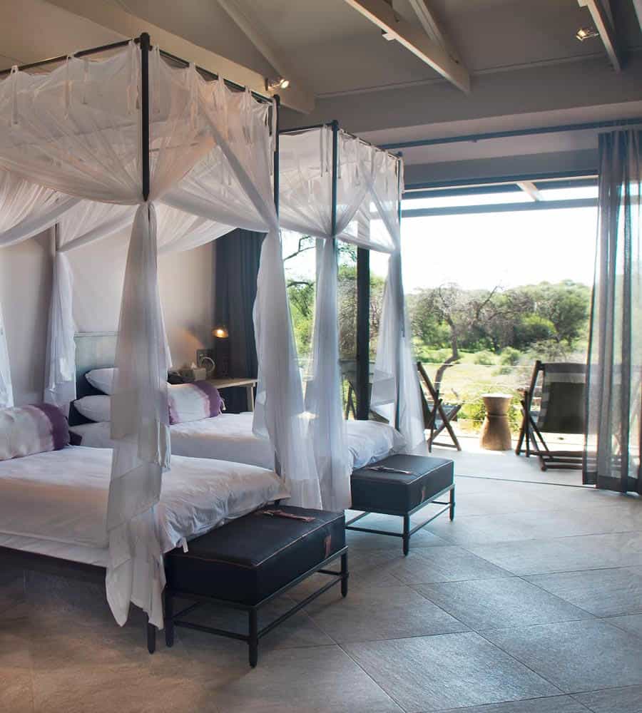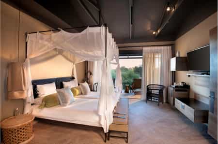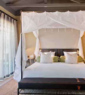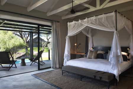 The rooms, which accommodate a total of just 20 guests, are decorated in contemporary yet classic African-style, with modern neutral shades of whites, browns and light grey. Each room has its own terrace furnished with directors' chairs and loungers perfectly positioned to view the game, and the gardens or the bushveld. All are air-conditioned, with en-suite bathrooms, minibars, satellite TV and safes. The river- and waterhole-side suites are larger in size and have additional lounge areas.